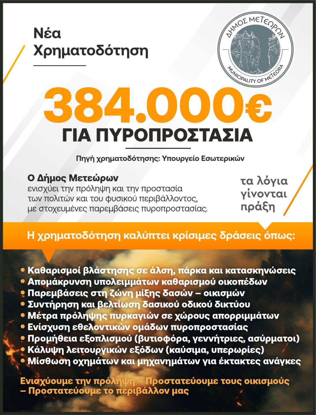 Ο Δήμος Μετεώρων εξασφάλισε χρηματοδότηση ύψους 384.000 ευρώ από το Υπουργείο Εσωτερικών για την αντιπυρική περίοδο του 2026, μετά από απόφαση του Υπουργού κ. Θεόδωρου Λιβάνιου.
