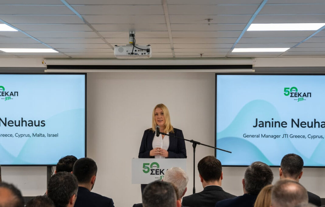 Η Διευθύνουσα Σύμβουλος της JTI Hellas, με ευθύνη για τις αγορές Ελλάδας, Ισραήλ, Κύπρου και Μάλτας, Janine Neuhaus, υπογράμμισε ότι η 50ετία δεν αντιμετωπίζεται ως επετειακή αναδρομή, αλλά ως σημείο εκκίνησης για το επόμενο στάδιο ανάπτυξης. Όπως ανέφερε, από την απόκτηση της ΣΕΚΑΠ το 2018, η JTI έχει υλοποιήσει επενδύσεις που υπερβαίνουν τα 40 εκατ. δολάρια, μετατρέποντας το εργοστάσιο σε πρότυπο παραγωγικής αριστείας εντός του Ομίλου.