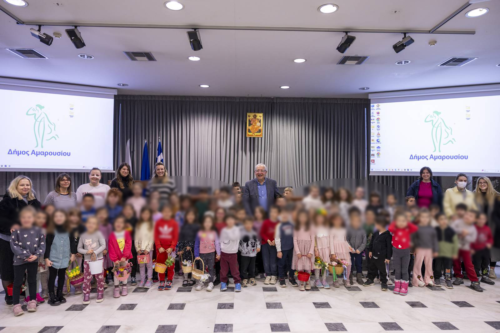 Ο Δήμαρχος καλωσόρισε με θέρμη τα νήπια και τα προνήπια, που με τα πασχαλινά καλαθάκια ανά χείρας απέδωσαν με ενθουσιασμό τα «Κάλαντα του Λαζάρου», και τους ευχήθηκε ολόψυχα να περάσουν όμορφα και χαρούμενα τις άγιες ημέρες του Πάσχα.