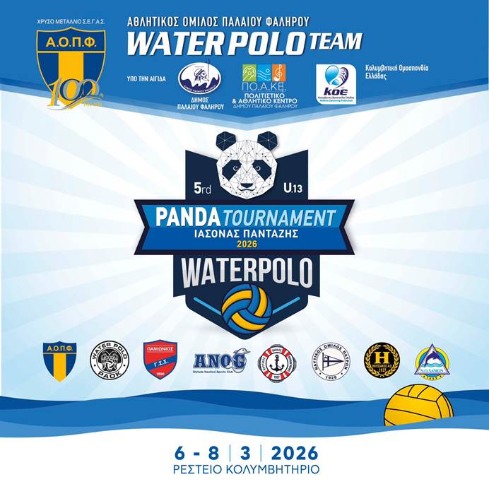 Ο Δήμος Παλαιού Φαλήρου προσκαλεί τους δημότες και τους φίλους του αθλητισμού να παρακολουθήσουν το Τουρνουά Υδατοσφαίρισης «5ο PANDA TOURNAMENT – ΙΑΣΟΝΑΣ ΠΑΝΤΑΖΗΣ 2026», Κατηγορίας Παίδων Κ16, που θα διεξαχθεί από 6 έως 8 Μαρτίου 2026 στο Ρέστειο Κολυμβητήριο Παλαιού Φαλήρου.