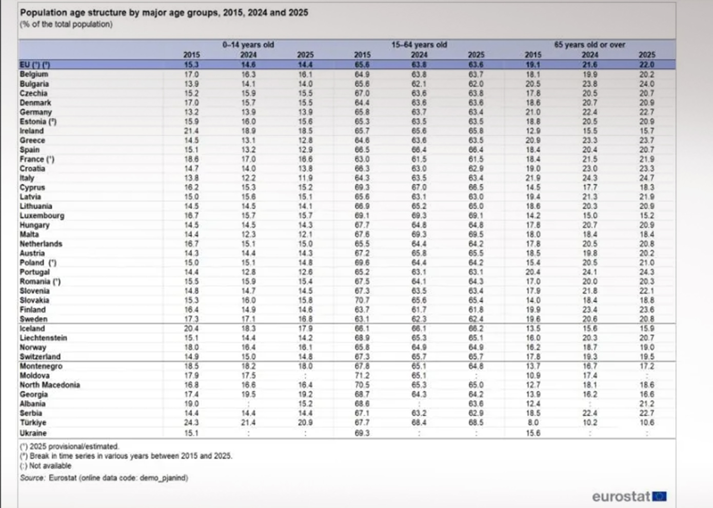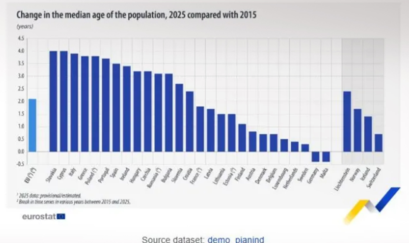 Η πληθυσμιακή γήρανση ήταν σημαντικότερη στη Σλοβακία και την Κύπρο. Στις δύο αυτές χώρες που είναι στην κορυφή της κατάταξης, η μέση ηλικία αυξήθηκε κατά 4,0 έτη. Τις δυο χώρες ακολουθεί η Ιταλία (+3,9 έτη), με την Ελλάδα και την Πολωνία να καταλαμβάνουν την τέταρτη θέση (καθεμία +3,8 έτη), και την Πορτογαλία να ακολουθεί (+3,7 έτη).