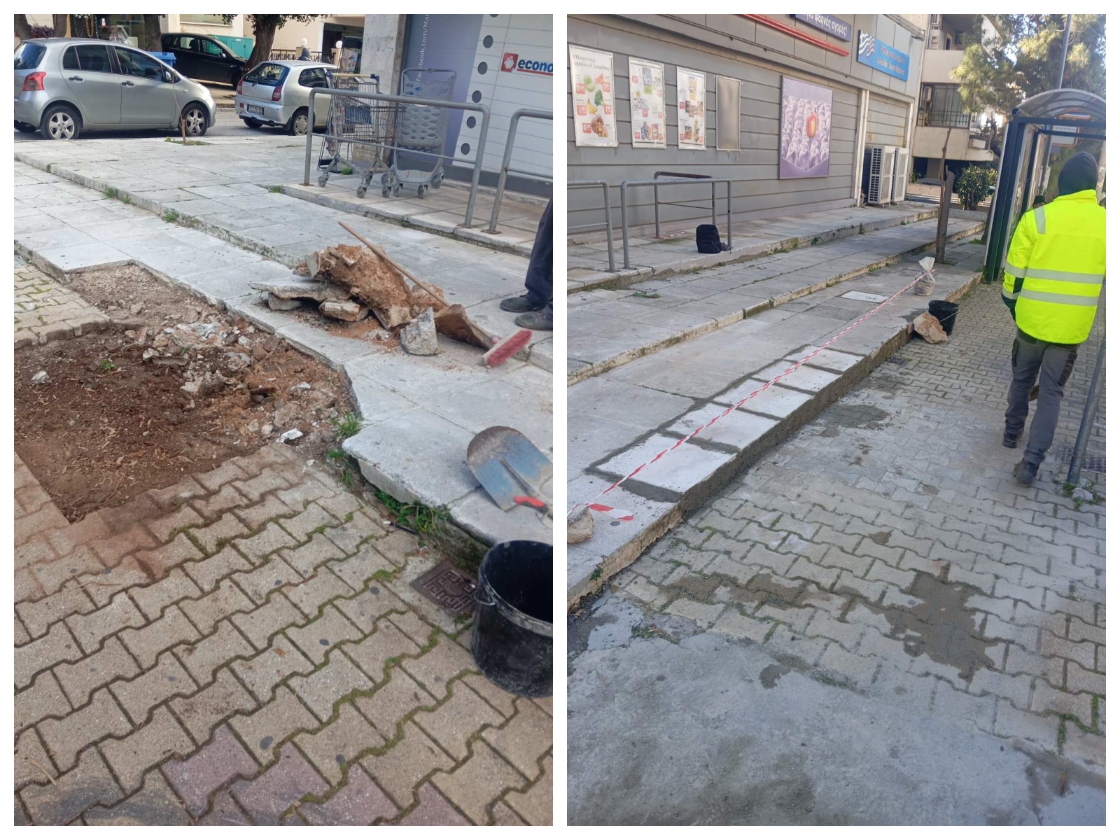 Εργασίες αποκατάστασης και συντήρησης πεζοδρομίων για βελτίωση της προσβασιμότητας και ασφάλειας των πεζών, υπό την επίβλεψη του Εντεταλμένου Συμβούλου Καθημερινότητας.