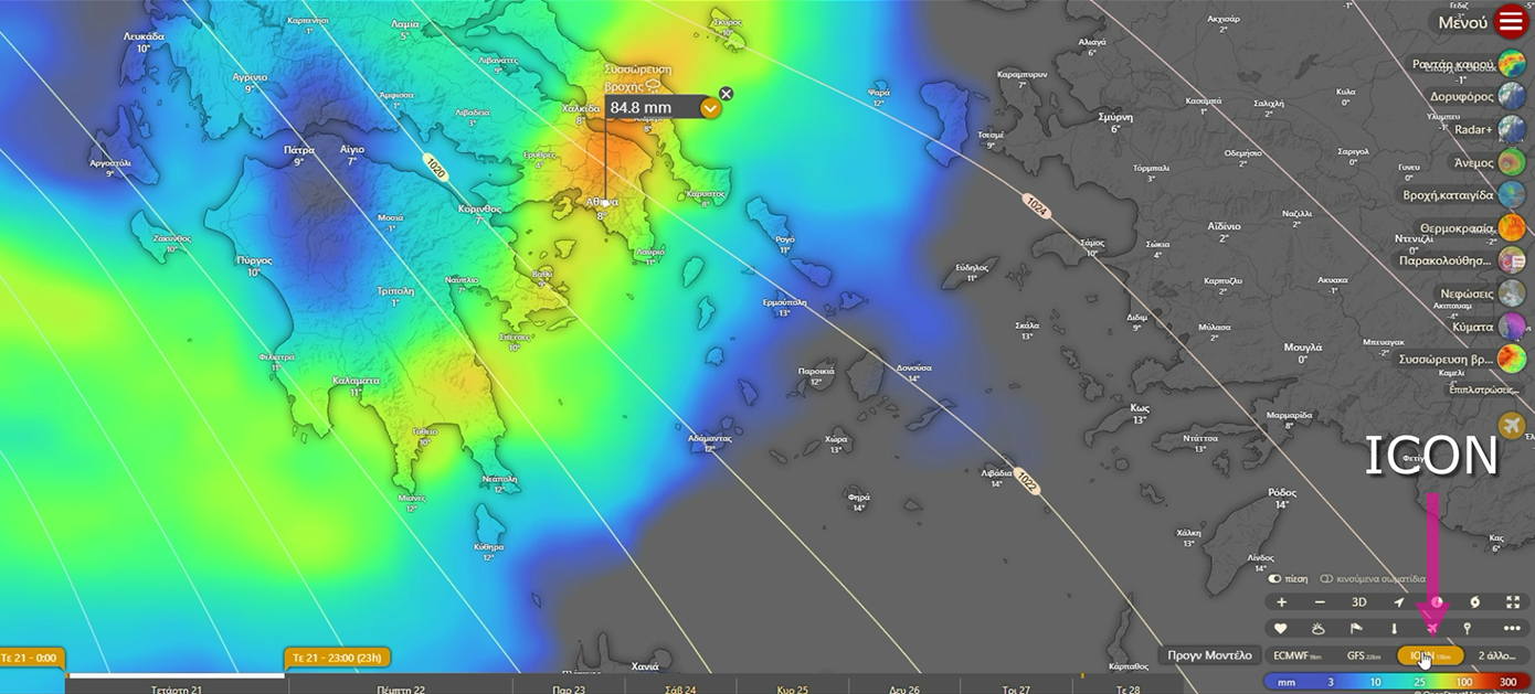 Το ICON δίνει σαφώς υψηλότερα αθροίσματα, με τοπικές τιμές που προσεγγίζουν ή ξεπερνούν τα 80 mm. Παρότι συχνά χαρακτηρίζεται ως «υπερβολικό», σε τέτοιες περιπτώσεις λειτουργεί ως προειδοποιητικό σήμα, καθώς αναγνωρίζει καλύτερα τη δυναμική ανατροφοδότηση και τη δυνατότητα τοπικών ραγδαιοτήτων. Αυτό δεν σημαίνει απαραίτητα πλήρη επαλήθευση, αλλά υποδηλώνει ότι το ανώτατο όριο κινδύνου είναι υψηλότερο από αυτό που παρουσιάζουν τα πιο συντηρητικά σενάρια.