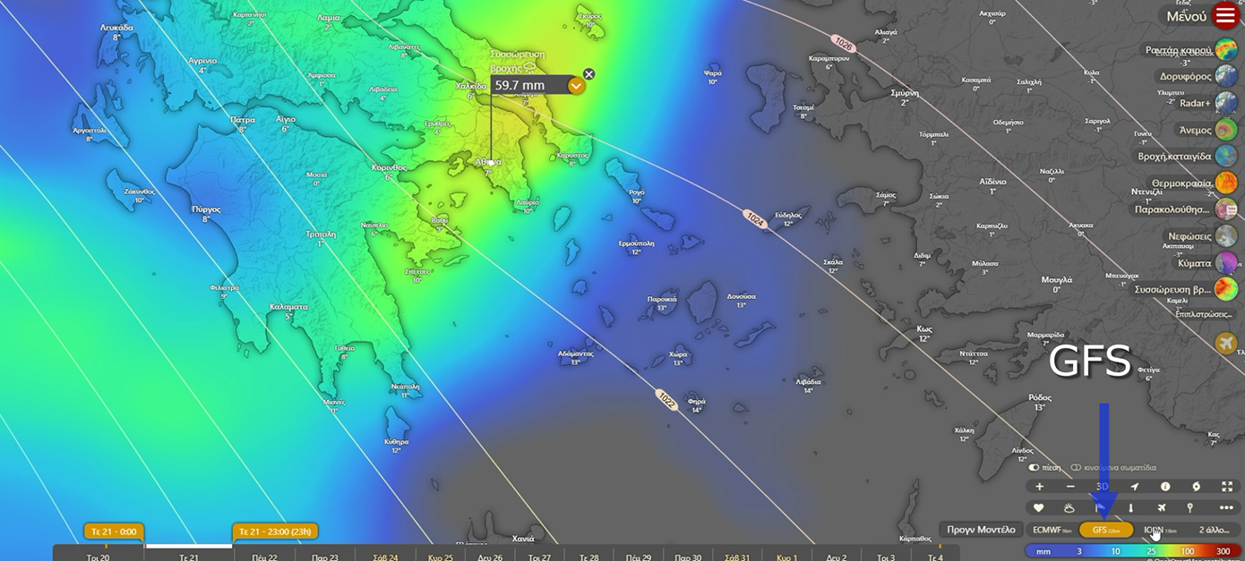 Το Ευρωπαϊκό μοντέλο εμφανίζεται πιο συγκρατημένο στα ύψη βροχής, με τιμές της τάξης των 40–60 mm για την Αττική. Το βασικό του πλεονέκτημα δεν είναι η ένταση, αλλά η χρονική συνοχή, καθώς από τρέξιμο σε τρέξιμο δεν παρουσιάζει απότομες διακυμάνσεις και αποτυπώνει καλύτερα τη διάρκεια του υετού. Η συμπεριφορά αυτή το καθιστά συχνά πιο αξιόπιστο σε επεισόδια παρατεταμένης βροχής χωρίς έντονη καταιγιδογενή δομή.