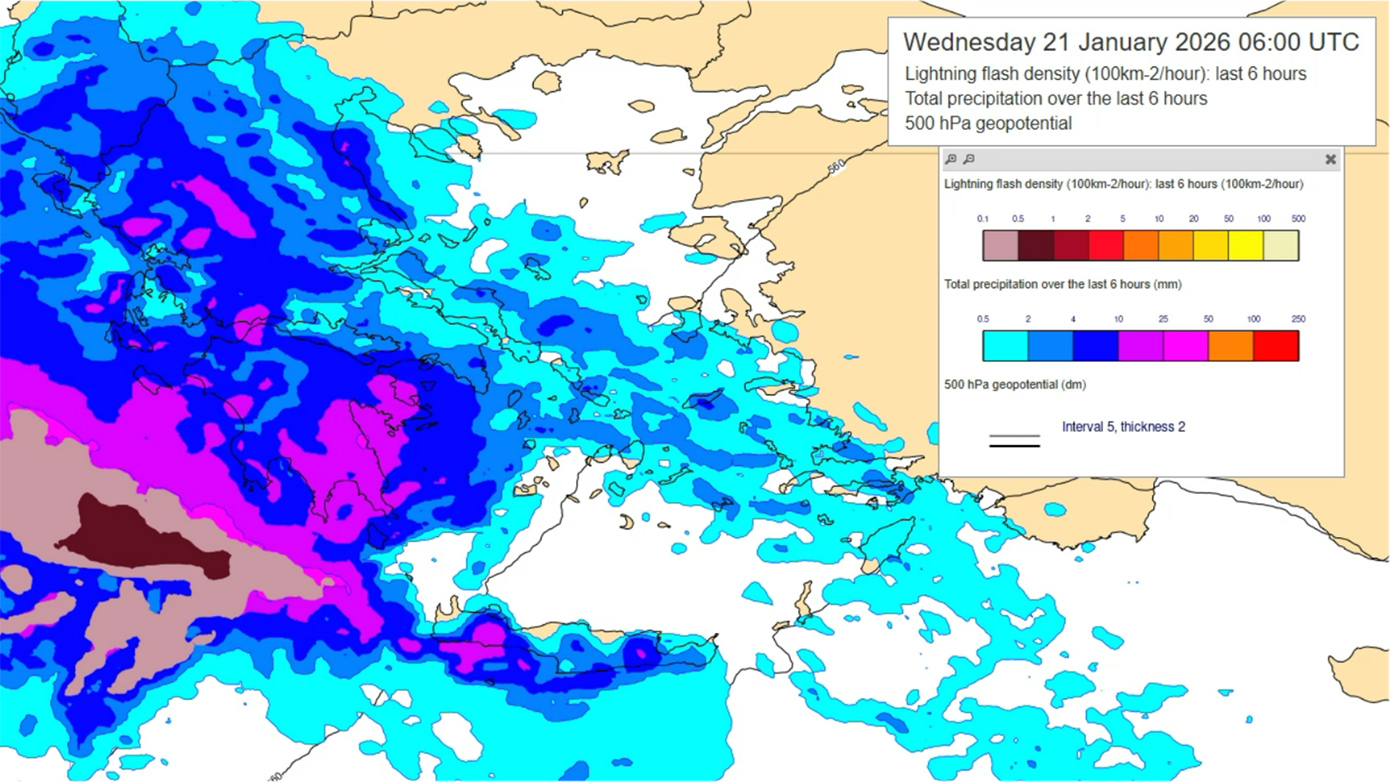 Η ζώνη υετού εξαπλώνεται ταχύτερα προς την κεντρική και ανατολική Ελλάδα, με πιο συνεκτικά φαινόμενα και σποραδικούς κεραυνούς. Στην Αττική, οι βροχές έρχονται νωρίτερα και πιο οργανωμένα, γίνονται πιο συνεχείς με τοπικές εντάσεις, κυρίως στα δυτικά και βόρεια, αποτελώντας τη χρονική ζώνη με τον μεγαλύτερο κίνδυνο υποεκτίμησης.