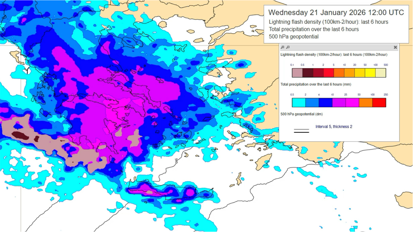 Το σύστημα εμφανίζεται ώριμο, με εκτεταμένες βροχές και εναλλαγές έντασης. Η κεραυνική δραστηριότητα γίνεται πιο αισθητή σε επιλεγμένες περιοχές, χωρίς γενικευμένες καταιγίδες. Στην Αττική, τα φαινόμενα συνεχίζονται με διακυμάνσεις, ενώ η συσσώρευση υετού αρχίζει να παίζει καθοριστικό ρόλο.