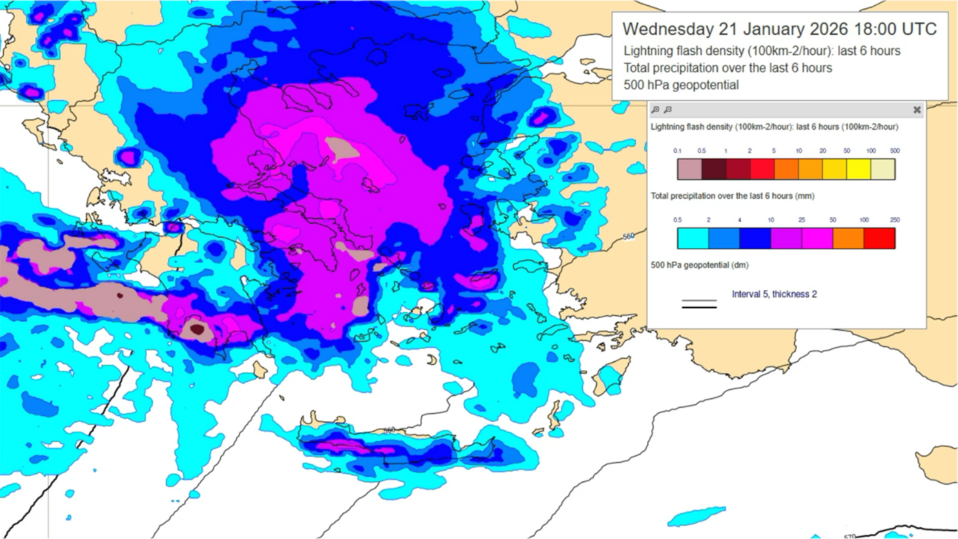 Σύμφωνα με την ανάλυσή του, η κακοκαιρία που επηρεάζει τη χώρα εξετάστηκε με διαχωρισμό του επεισοδίου σε τέσσερα διαδοχικά εξάωρα, μια προσέγγιση που επιτρέπει πιο ρεαλιστική αποτίμηση της χρονικής κατανομής των φαινομένων και αποφεύγει απλουστεύσεις που συχνά οδηγούν σε λανθασμένα συμπεράσματα. Όπως σημειώνει, το ευρωπαϊκό μοντέλο διαφοροποιείται από τα GFS και ICON κυρίως ως προς τα εκτιμώμενα ύψη βροχής, ωστόσο μέχρι στιγμής εμφανίζει πιο αξιόπιστη και σταθερή συμπεριφορά. Τα νεότερα τρεξίματά του συγκλίνουν σε ελαφρώς αυξημένα 24ωρα αθροίσματα υετού σε σχέση με τις πρωινές προγνώσεις, χωρίς να μεταβάλλεται η συνολική εικόνα της κακοκαιρίας.