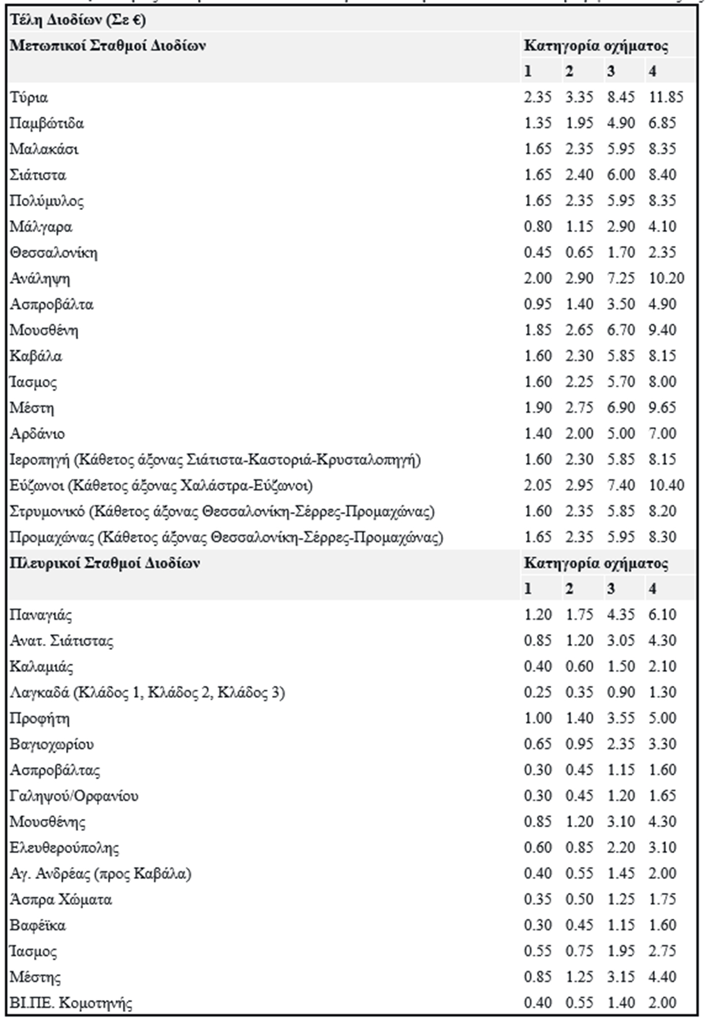 Σύμφωνα με τα στοιχεία που εξασφάλισε το ΑΠΕ-ΜΠΕ, το συνολικό κόστος διέλευσης για ένα Ι.Χ. όχημα από την Ηγουμενίτσα έως τους Κήπους Έβρου, μέσω όλων των μετωπικών σταθμών, θα διαμορφωθεί σε 30,45 ευρώ από 24,45 ευρώ σήμερα. Σημειώνεται ότι παύουν να ισχύουν τα εκπτωτικά συνδρομητικά προγράμματα της υπηρεσίας EgnatiaPass. Αναλυτικά, οι τιμές ανά μετωπικό και πλευρικό σταθμό διοδίων θα διαμορφωθούν ως εξής: