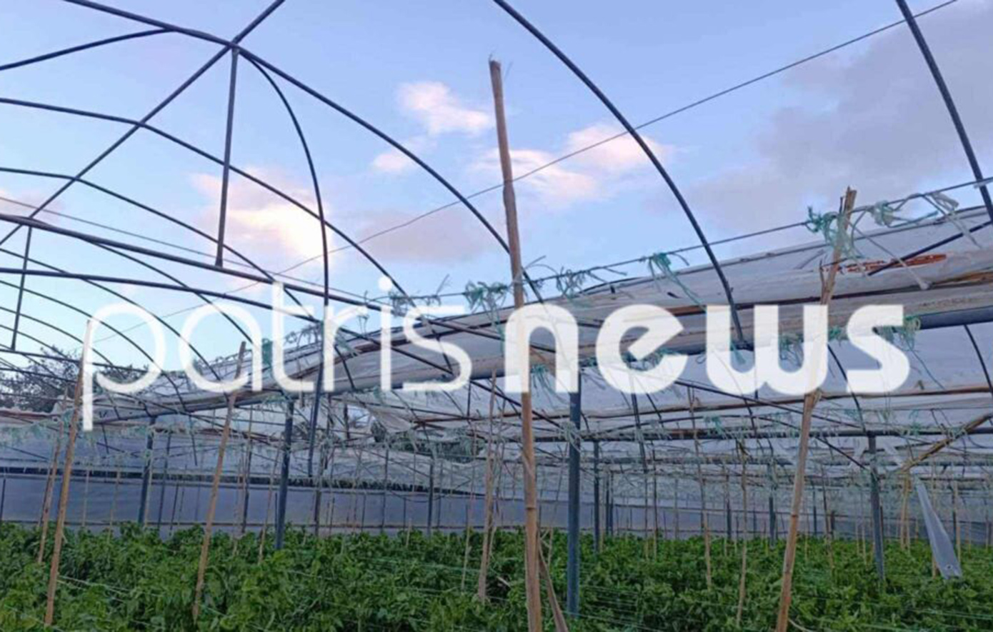 Ο ανεμοστρόβιλος σάρωσε την περιοχή μέσα σε λίγα λεπτά, προκαλώντας εκτεταμένες ζημιές σε θερμοκήπια, με τον άνεμο να ξεριζώνει τα σίδερα και τα νάιλον και να τα σκορπίζει παντού.