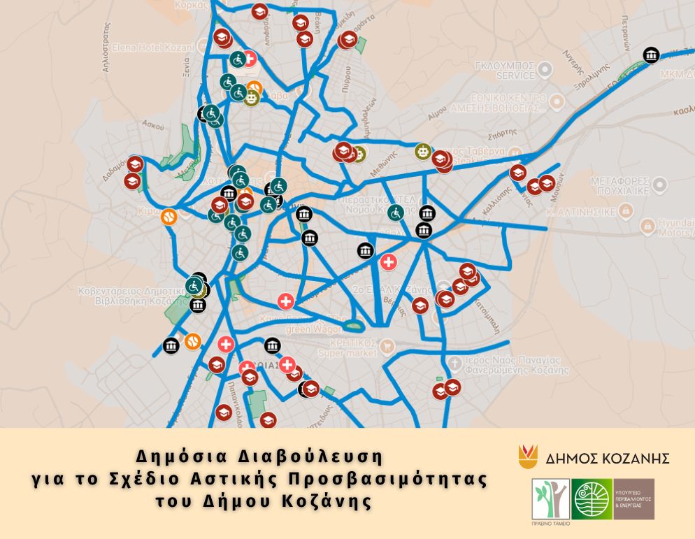 Ο Δήμος Κοζάνης, αντιλαμβανόμενος την ανάγκη επίλυσης ενός σημαντικού αριθμού προβλημάτων που σχετίζονται άμεσα με την προσβασιμότητα των πολιτών, εκπονεί Σχέδιο Αστικής Προσβασιμότητας (Σ.Α.Π.), σύμφωνα με τον Ν. 4819/2021 και με χρηματοδότηση από το Πράσινο Ταμείο.