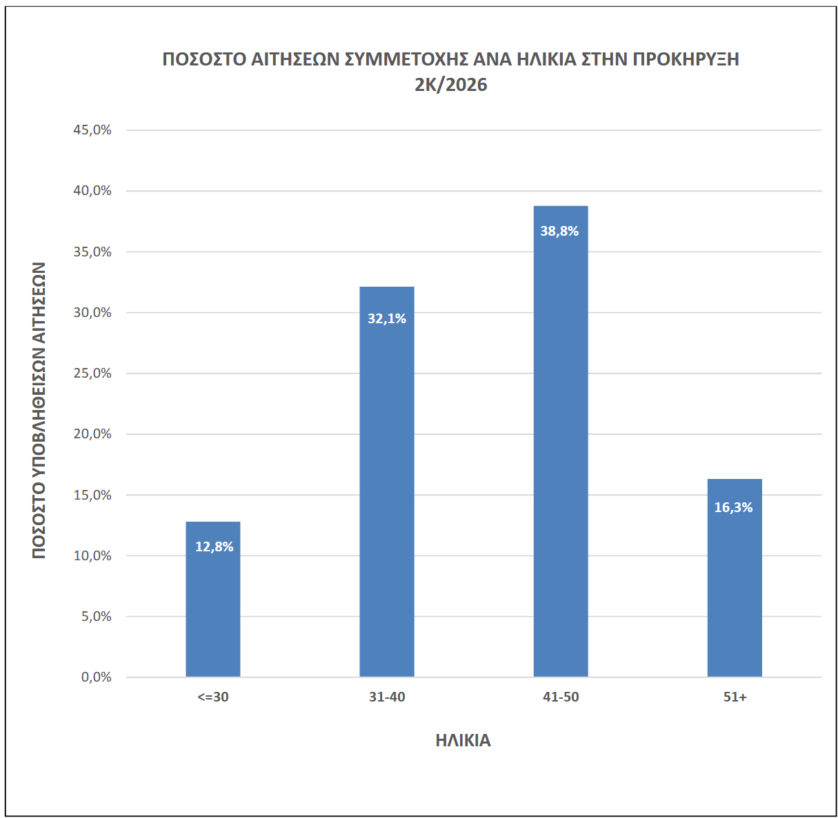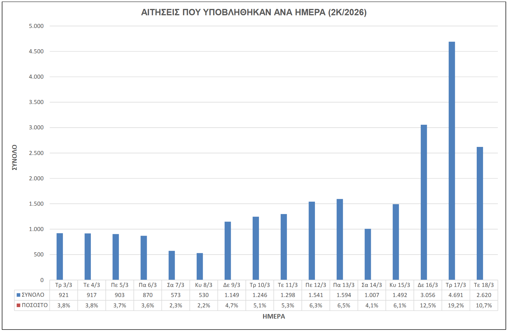 Στο πλαίσιο της προκήρυξης 2Κ/2026 του ΑΣΕΠ (Φ.Ε.Κ. 9/16.02.2026/τ. Α.Σ.Ε.Π.) που αφορά στην πλήρωση με σειρά προτεραιότητας 1.696 θέσεων μόνιμου προσωπικού σε φορείς του Υπουργείου Υγείας και προσωπικού με σχέση εργασίας Ιδιωτικού Δικαίου Ορισμένου Χρόνου διάρκειας τριών ετών στο Γενικό Νοσοκομείο Παπαγεωργίου (Ν.Π.Ι.Δ.) Τεχνολογικής και Δευτεροβάθμιας Εκπαίδευσης, σύμφωνα με το άρθρο 28 του ν. 4765/2021, υποβλήθηκαν συνολικά 24.408 αιτήσεις.