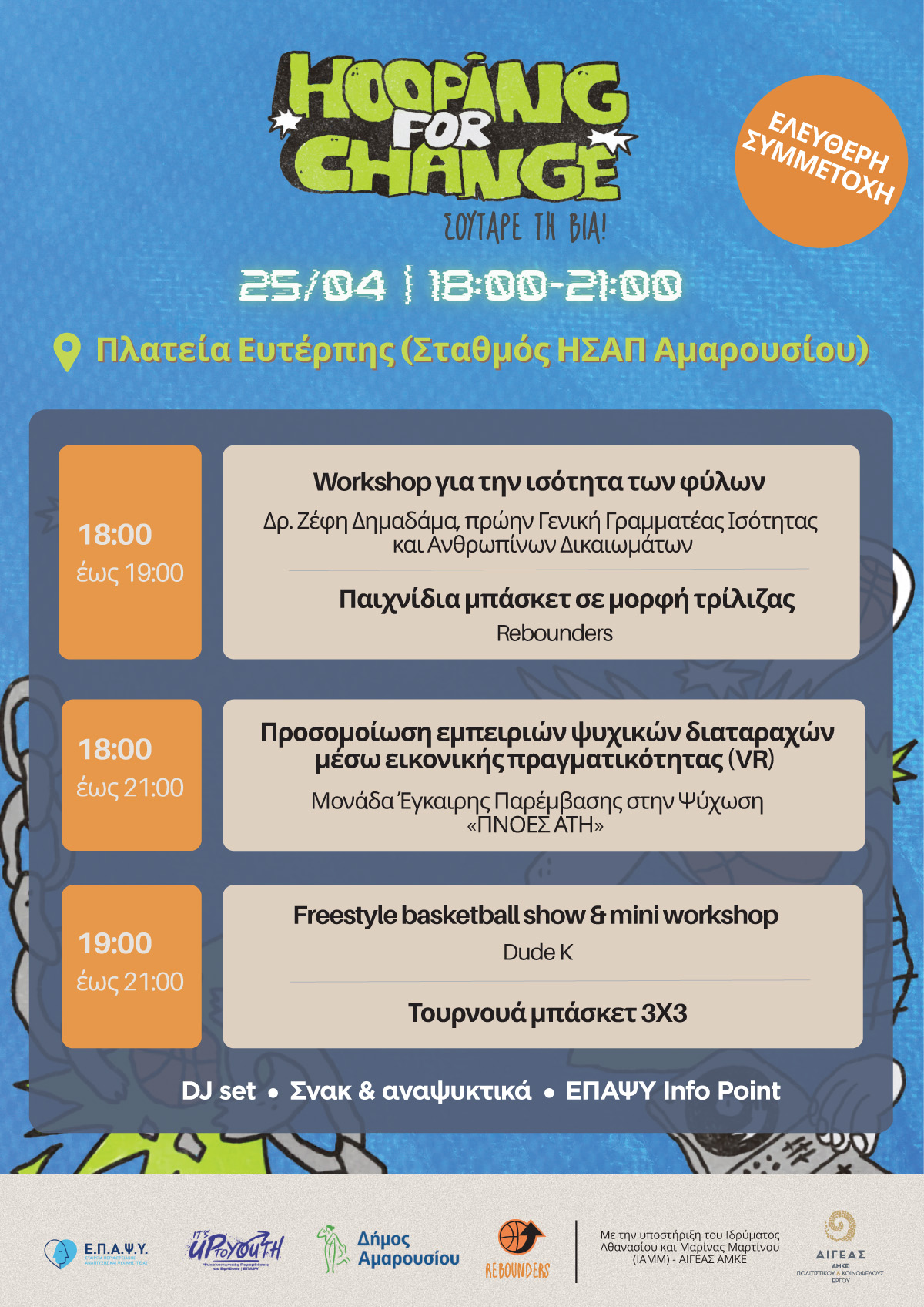 Ο Δήμος Αμαρουσίου στηρίζει και φιλοξενεί τη δράση «Hooping for Change», μια ανοιχτή street εκδήλωση που συνδέει τον αθλητισμό με την ψυχική υγεία, το Σάββατο 25 Απριλίου 2026, από τις 18:00 έως τις 21:00, στην Πλατεία Ευτέρπης (Σταθμός ΗΣΑΠ Αμαρουσίου).