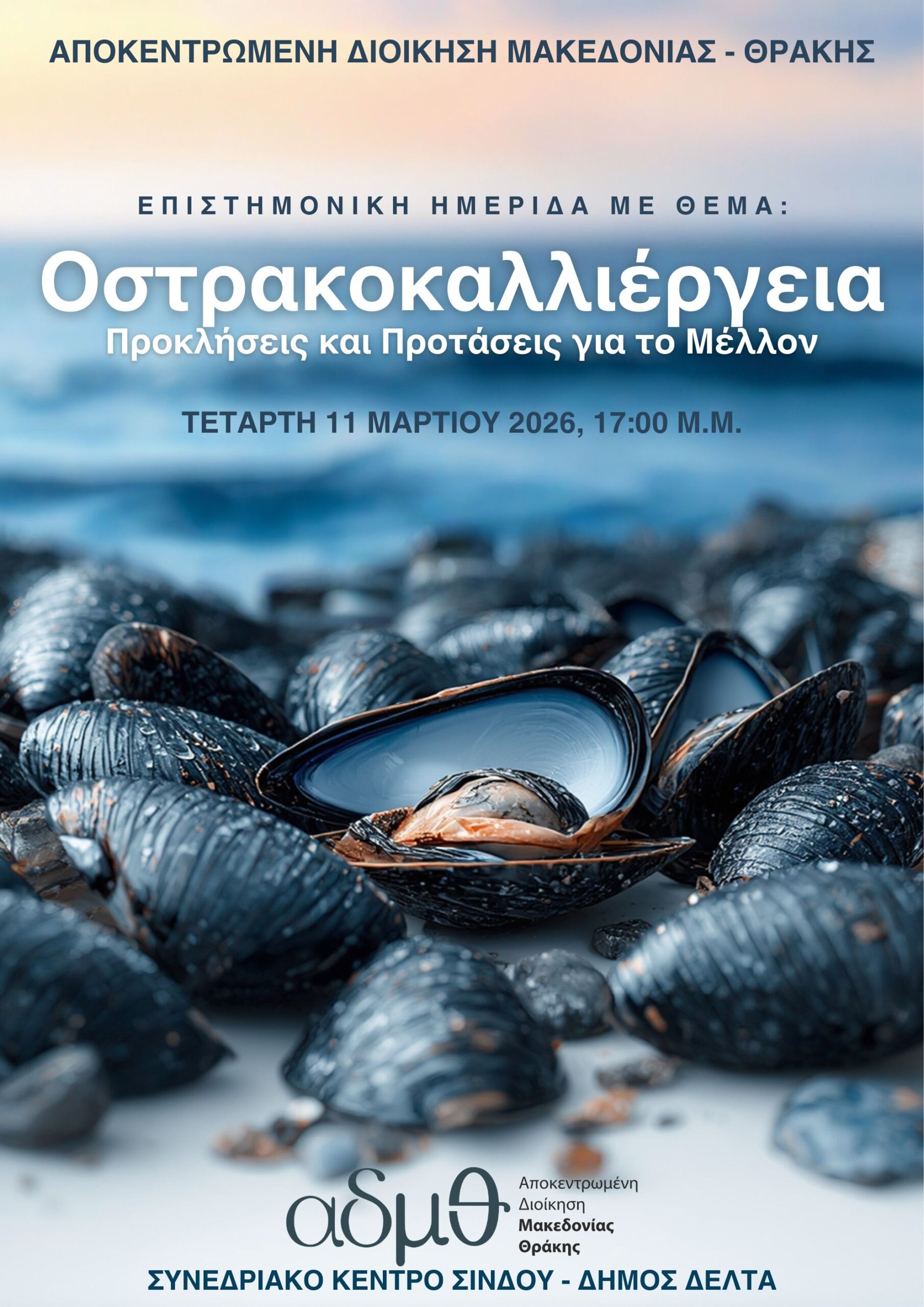 Επιστημονική ημερίδα με θέμα «Οστρακοκαλλιέργεια: Προκλήσεις και Προτάσεις για το Μέλλον» διοργανώνει η Αποκεντρωμένη Διοίκηση Μακεδονίας Θράκης στο Συνεδριακό Κέντρο Σίνδου (Αλ. Παπάγου 7, Σίνδος) του Δήμου Δέλτα, την Τετάρτη 11 Μαρτίου 2026.