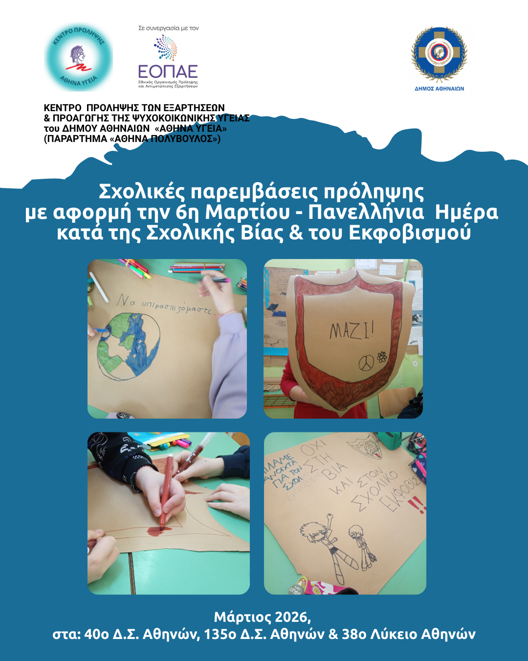 Μήνυμα στήριξης και ευαισθητοποίησης προς τους μαθητές, τους γονείς και τους εκπαιδευτικούς στέλνει ο Δήμος Αθηναίων μέσα από τα Κέντρα Πρόληψης «Αθηνά Υγεία» του Δήμου. Με αφορμή την Πανελλήνια Ημέρα κατά της Σχολικής Βίας και του Εκφοβισμού (6 Μαρτίου), πραγματοποιήθηκαν δράσεις πρόληψης κατά της επιθετικότητας, της βίας και του σχολικού εκφοβισμού σε σχολεία του Δήμου.