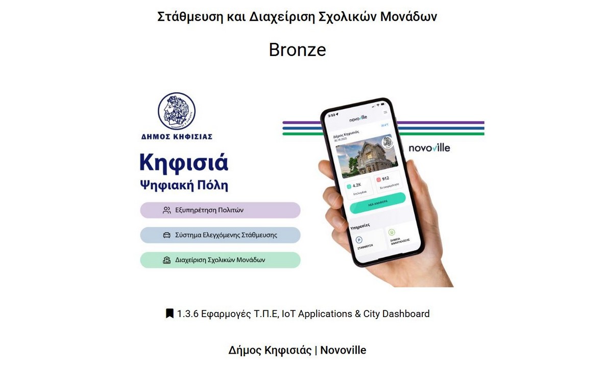 Παρουσία εκπροσώπων της κυβέρνησης, της Τοπικής Αυτοδιοίκησης και επιχειρήσεων, ο Δήμος Κηφισιάς τιμήθηκε με το χάλκινο Βραβείο της κατηγορίας “Εφαρμογές Τ.Π.Ε (Τεχνολογιών Πληροφορίας και Επικοινωνίας), IoT Applications & City Dashboard” για την ψηφιακή πλατφόρμα εξυπηρέτησης πολιτών “Νοvoville”, τη διαχείριση της ελεγχόμενης στάθμευσης και των σχολικών μονάδων.