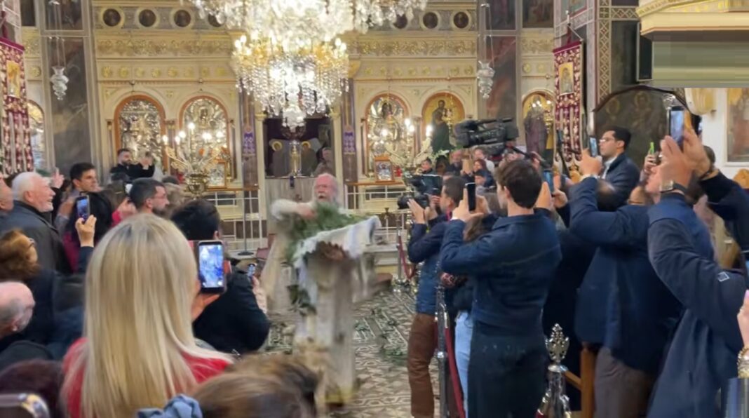 Ο ιερέας, με εντυπωσιακή κίνηση, ρίχνει δάφνες από ψηλά, δημιουργώντας μια ατμόσφαιρα κατάνυξης και χαράς, που συγκινεί τους πιστούς στον Ιερό Ναό της Παναγίας Ευαγγελίστριας.