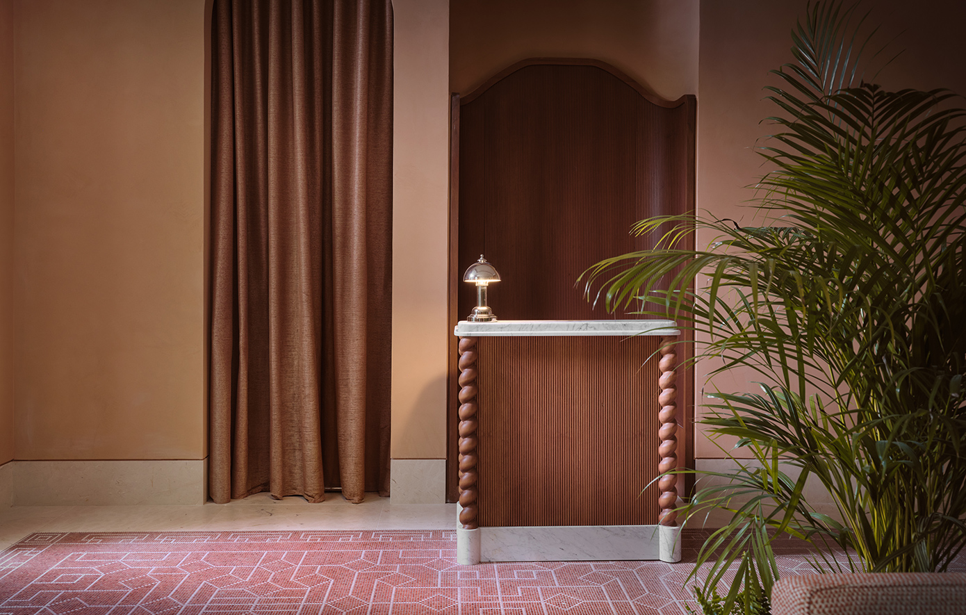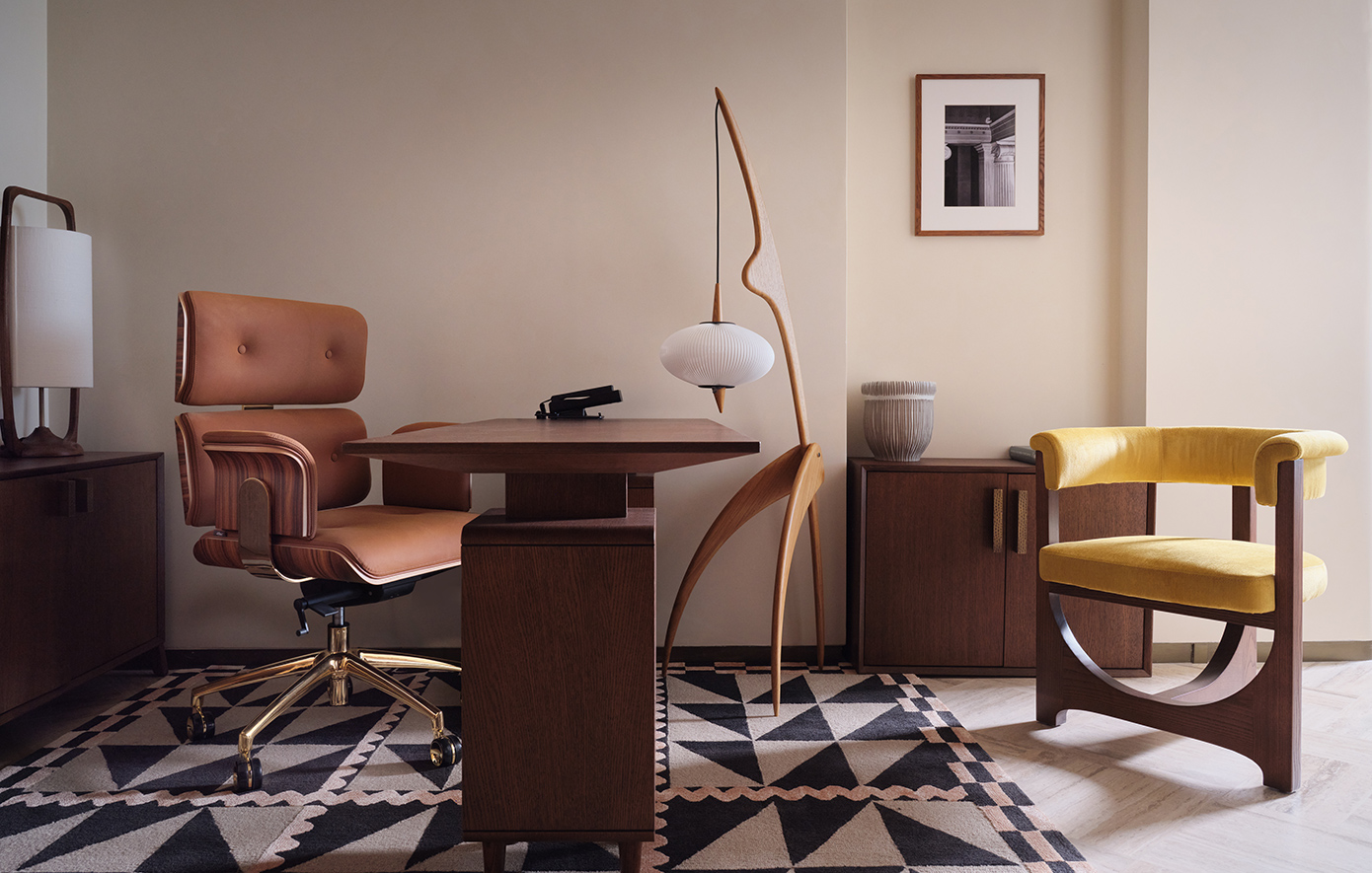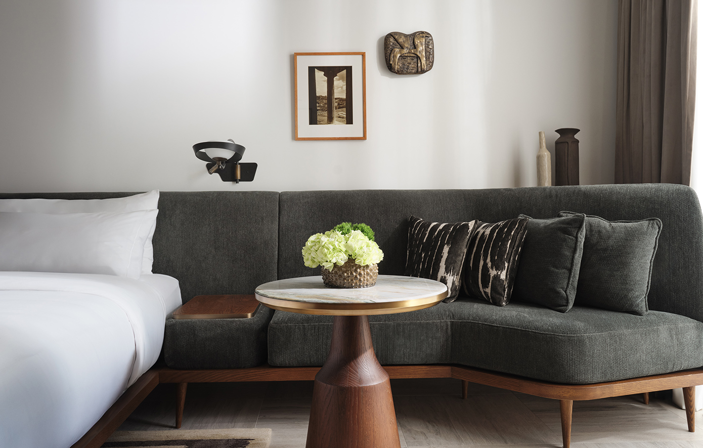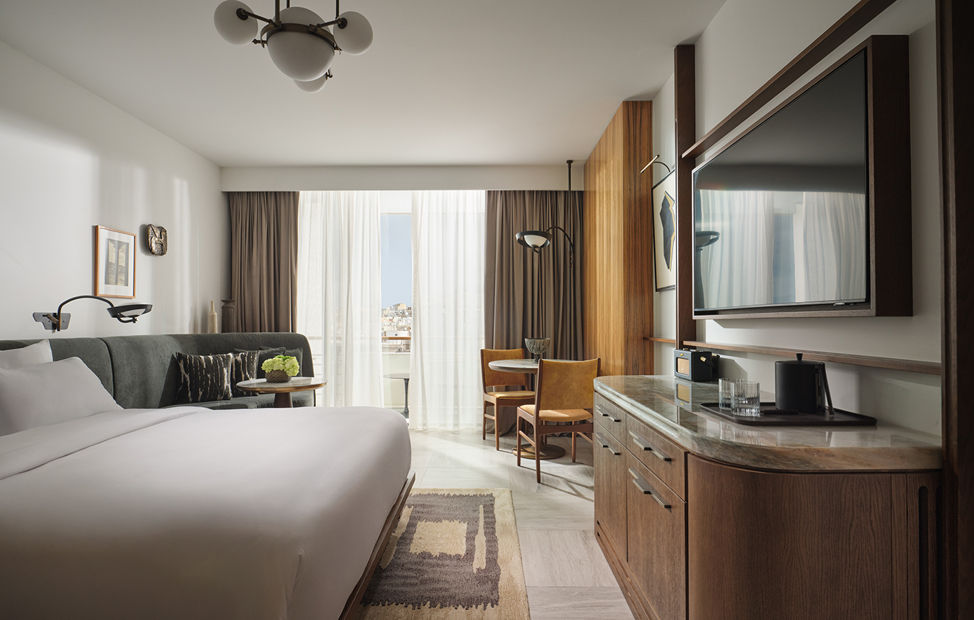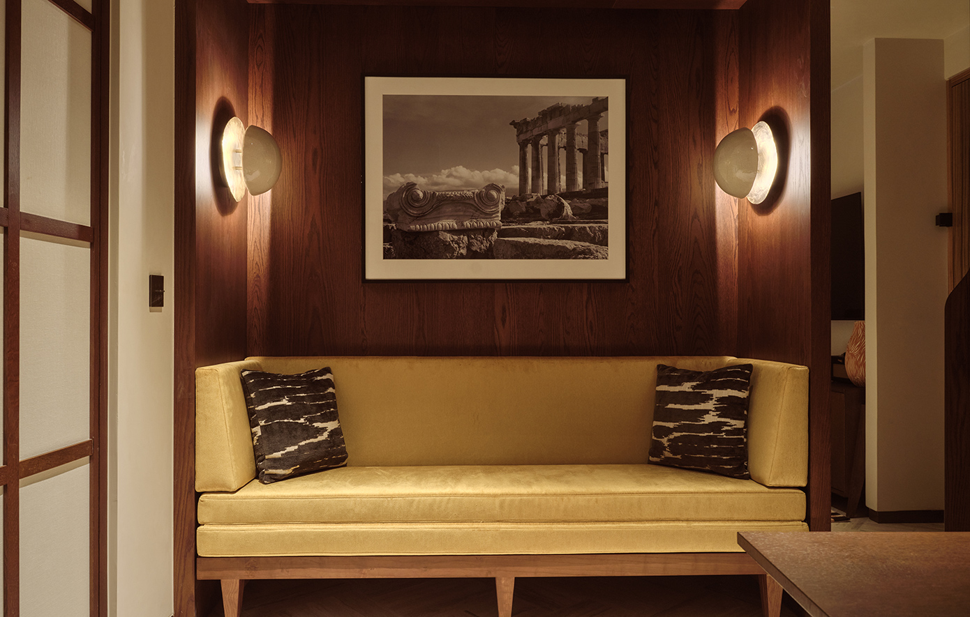 Ο εσωτερικός σχεδιασμός, υπό την επιμέλεια του AvroKO, αναβιώνει την αισιοδοξία του αθηναϊκού μοντερνισμού, συνδυάζοντας mid-century στοιχεία με νέα έργα τέχνης και ειδικά σχεδιασμένα κομμάτια από το ιστορικό αθηναϊκό επιπλοποιείο Σαρίδη και την κεραμίστρια Ελένη Βερναδάκη.
