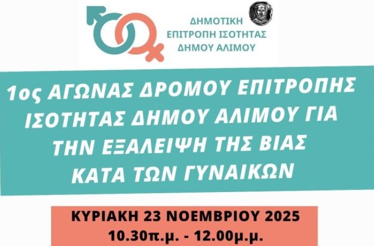 Με αφορμή την Παγκόσμια Ημέρα για την Εξάλειψη της Βίας κατά των Γυναικών (25 Νοεμβρίου), η Επιτροπή Ισότητας του Δήμου Αλίμου (Δ.ΕΠ.ΙΣ.) διοργανώνει την Κυριακή 23 Νοεμβρίου 2025 και ώρα 10.30 π.μ. συμβολικό αγώνα δρόμου 1 χιλιομέτρου, με τίτλο: «Τρέχουμε για την Εξάλειψη της Βίας κατά των Γυναικών».