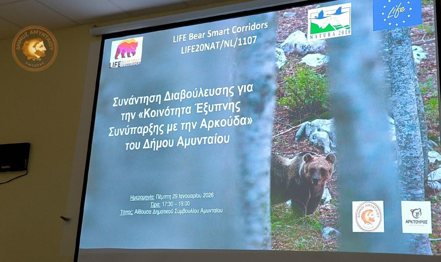 Με επιτυχία πραγματοποιήθηκε την Πέμπτη 29 Ιανουαρίου 2026, στην Αίθουσα Δημοτικού Συμβουλίου Αμυνταίου, η ανοιχτή συνάντηση εργασίας και διαβούλευσης για τη δημιουργία της «Κοινότητας Έξυπνης Συνύπαρξης με την Αρκούδα», στο πλαίσιο της συμμετοχής του Δήμου Αμυνταίου στο ευρωπαϊκό πρόγραμμα LIFE Bear-Smart Corridors, σε συνεργασία με την περιβαλλοντική οργάνωση ΑΡΚΤΟΥΡΟΣ.