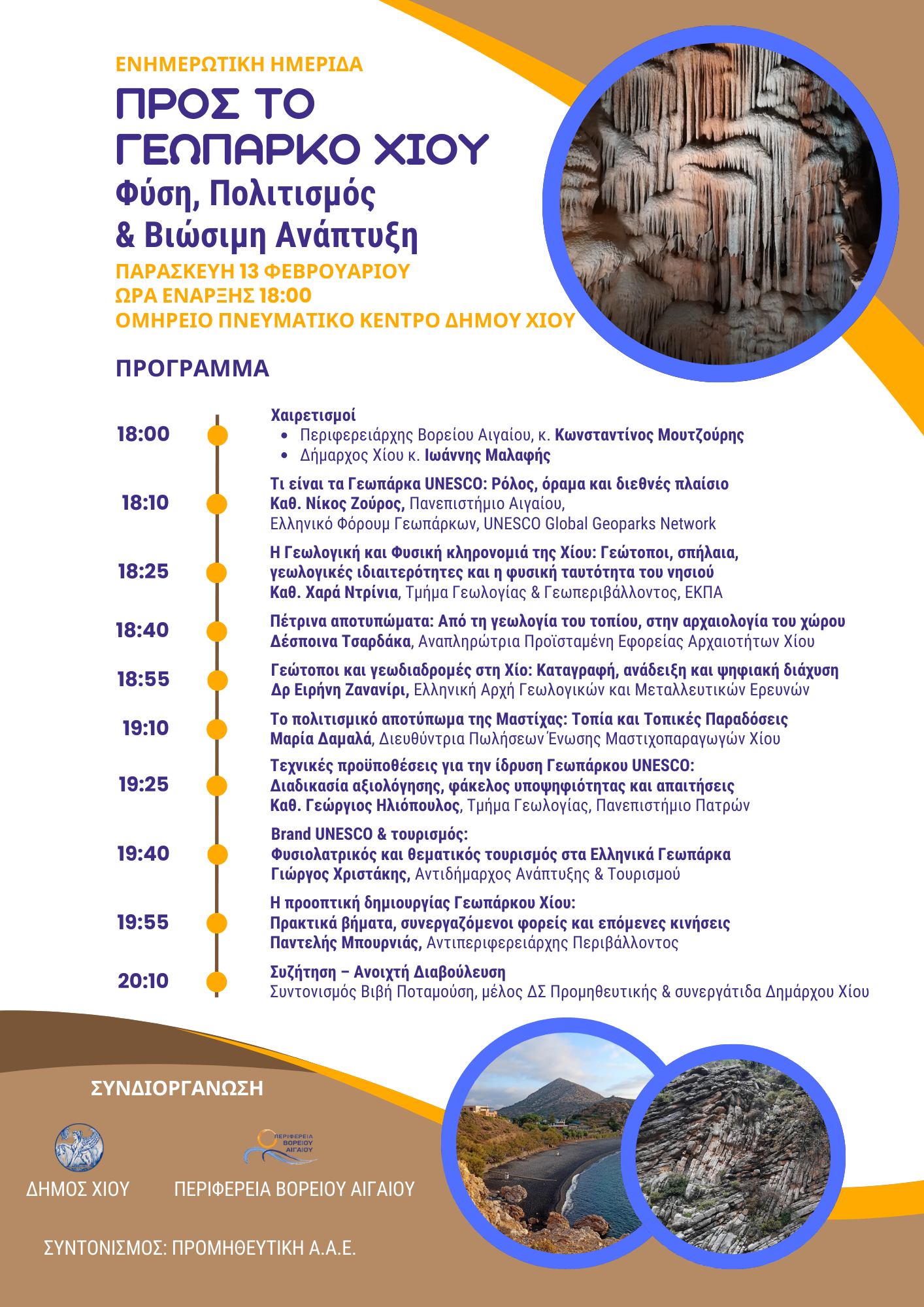Η Περιφέρεια Βορείου Αιγαίου και ο Δήμος Χίου συνδιοργανώνουν ενημερωτική ημερίδα με θέμα την προοπτική δημιουργίας Γεωπάρκου UNESCO στη Χίο, την Παρασκευή 13 Φεβρουαρίου 2026, από τις 18:00 έως τις 21:00, στην αίθουσα συνεδρίων του Ομήρειου Πνευματικού Κέντρου Δήμου Χίου.