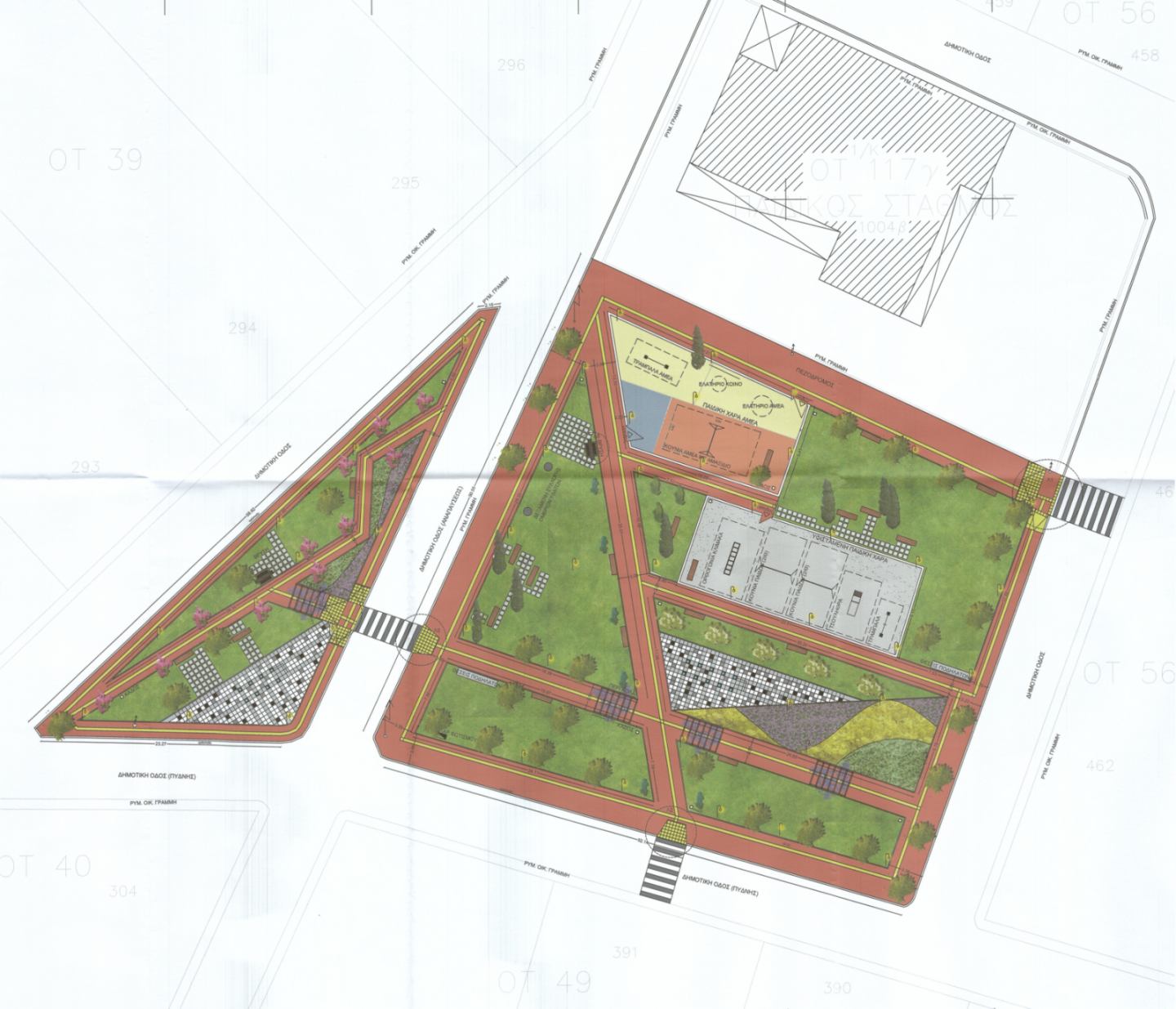 Στο πάρκο του Ο.Τ. 117α, αντίστοιχες παρεμβάσεις περιλαμβάνουν διαδρομές περιπάτου, σημεία στάσης με καθιστικά, φύτευση νέων δέντρων και υποδομές άρδευσης, ώστε ο χώρος να λειτουργεί ως μια πράσινη όαση μέσα στον οικισμό.