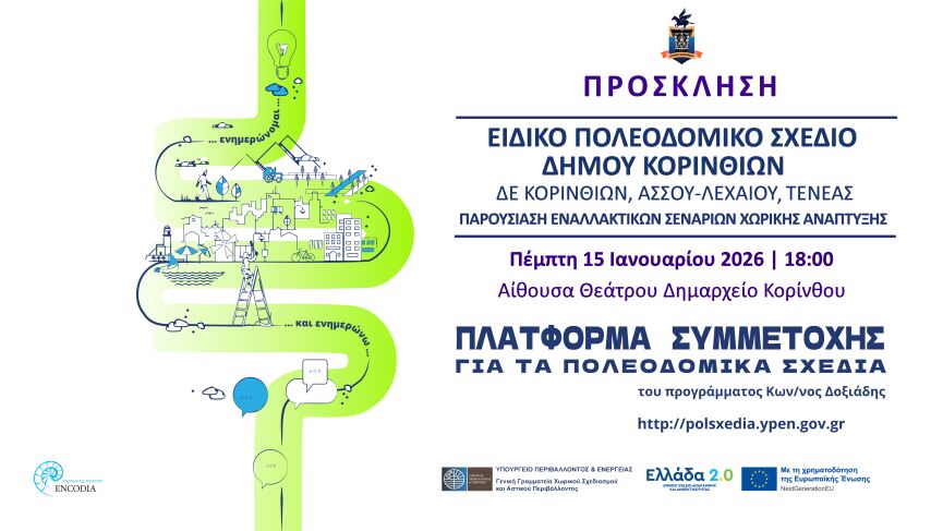 Η εκδήλωση θα πραγματοποιηθεί την Πέμπτη 15 Ιανουαρίου, και ώρα 18:00, στην Αίθουσα του Θεάτρου του Δημαρχείου Κορινθίων (Κολιάτσου 32, Κόρινθος), με στόχο την ενημέρωση και ενεργή συμμετοχή των πολιτών, των τοπικών φορέων και των επαγγελματιών της περιοχής στη διαμόρφωση του τελικού σχεδιασμού.