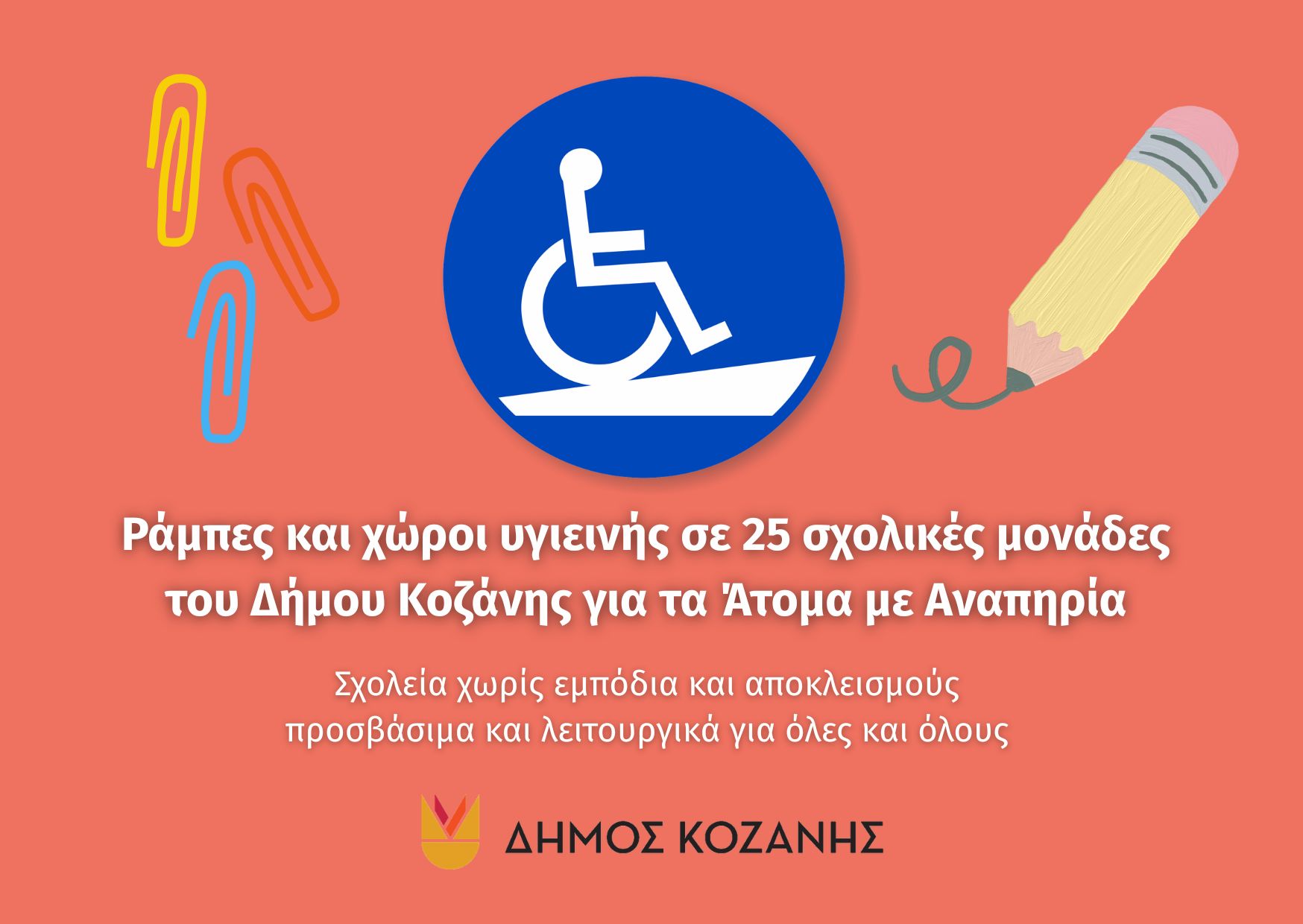Το έργο, συνολικού προϋπολογισμού 435.000€, φέρει τον τίτλο «Κατασκευή ραμπών και χώρων υγιεινής για την πρόσβαση και την εξυπηρέτηση ΑΜΕΑ σε σχολικές μονάδες του Δήμου Κοζάνης» με Κωδικό ΟΠΣ 6034664 και συγχρηματοδότηση από το Ευρωπαϊκό Ταμείο Περιφερειακής Ανάπτυξης και αφορά 25 σχολικά συγκροτήματα του Δήμου Κοζάνης (Νηπιαγωγεία, Δημοτικά, Γυμνάσια και Λύκεια).