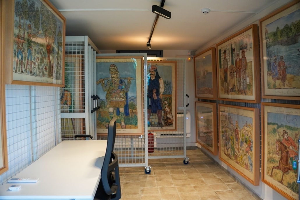 Μετά από την ολοκλήρωση των εργασιών επισκευής του κτιρίου αποθήκευσης και την προμήθεια εξοπλισμού ασφάλειας, κλιματισμού, κ.α. με στόχο τη δημιουργία των κατάλληλων συνθηκών του χώρου από τον Δήμο, η Υπηρεσία του Υπουργείου ανέλαβε τη σχεδίαση και την τοποθέτηση των έργων με στόχο τη μέγιστη αξιοποίηση του διαθέσιμου χώρου, προτείνοντας την εγκατάσταση τριών σταθερών πλαισίων και δέκα συρόμενων μεταλλικών πλαισίων με πλέγμα, μουσειακών προδιαγραφών, τα οποία επιτρέπουν την ανάρτηση των έργων και από τις δύο πλευρές.