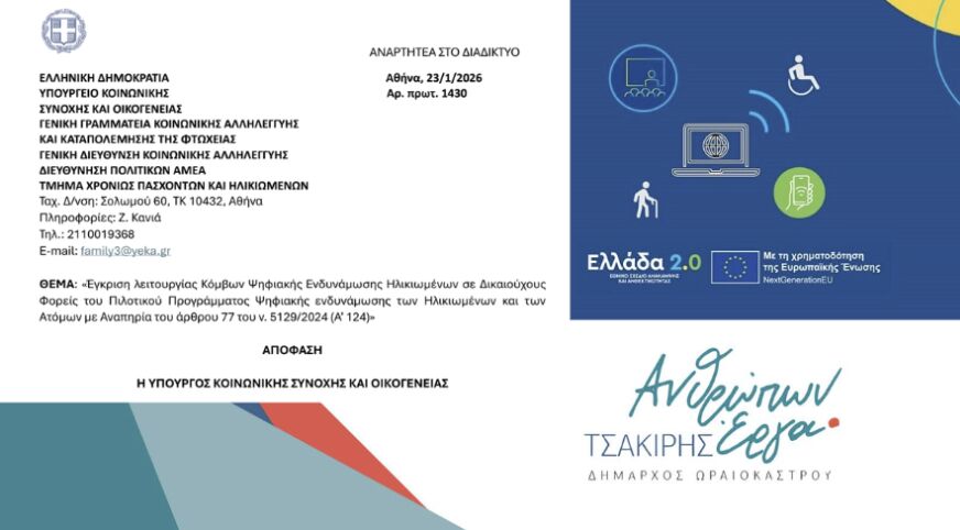 Με απόφαση της υπουργού Κοινωνικής Συνοχής και Οικογένειας, Δόμνας Μιχαηλίδου, εγκρίθηκε η πρόταση που κατέθεσε η δημοτική αρχή για την λειτουργία Κόμβων Ψηφιακής Ενδυνάμωσης Ηλικιωμένων σε δικαιούχους φορείς του Πιλοτικού Προγράμματος Ψηφιακής Ενδυνάμωσης των Ηλικιωμένων και των ατόμων με αναπηρία.