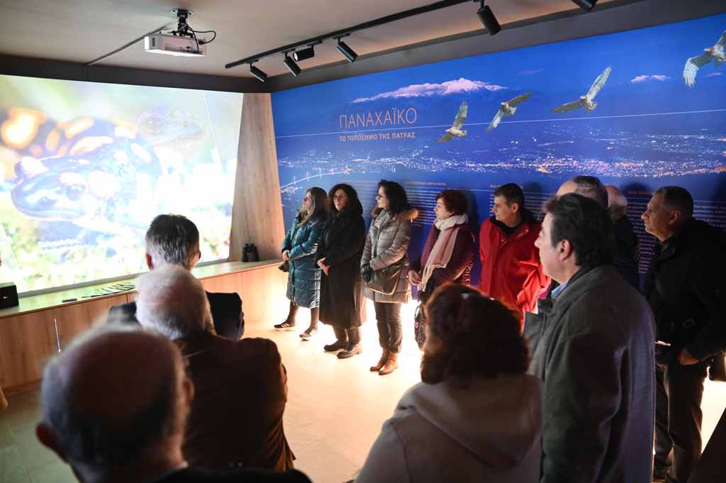 Ακολούθησε ξενάγηση στον εκθεσιακό χώρο από τον Κωνσταντίνο Κωνσταντακόπουλο, ο οποίος παρουσίασε τα νέα μέσα και δυνατότητες του Κέντρου, που αναδεικνύουν και προβάλλουν την σπάνια βιοποικιλότητα του Παναχαϊκού όρους.