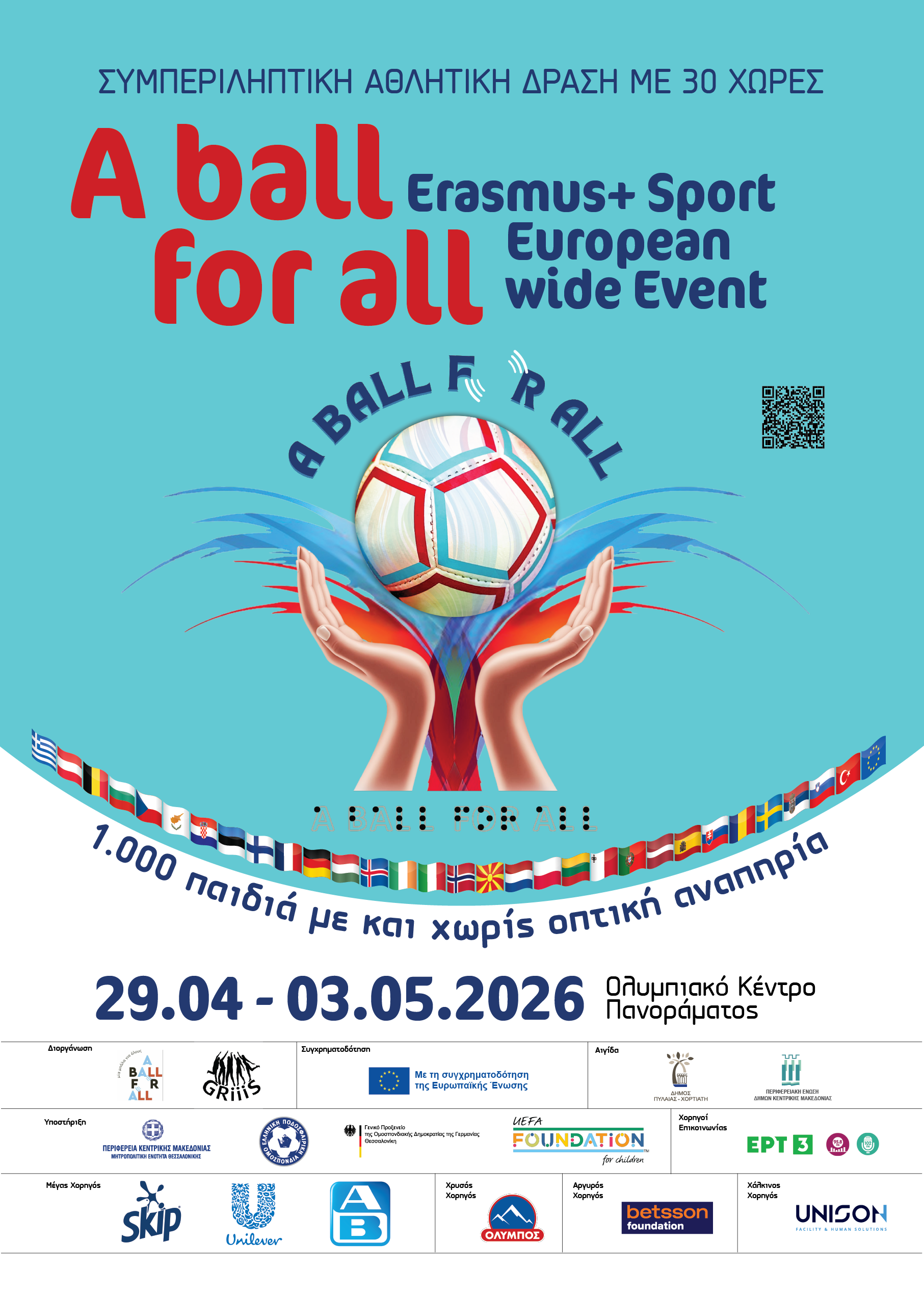 Η συμπεριληπτική δράση «Μία μπάλα για όλους» τελεί υπό την αιγίδα του Δήμου Πυλαίας Χορτιάτη και ΠΕΔΚΜ – Περιφερειακή Ένωση Δήμων Κεντρικής Μακεδονίας και θα φιλοξενηθεί στο Ολυμπιακό Κέντρο Πανοράματος. Θα συμμετέχουν 1.000 παιδιά με και χωρίς οπτική αναπηρία και αποστολές 30 χωρών.