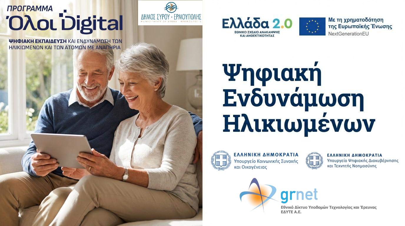 Ο Δήμος Σύρου – Ερμούπολης βρίσκεται στην ευχάριστη θέση να ανακοινώσει την επιτυχή έναρξη των εκπαιδευτικών τμημάτων του προγράμματος «Ψηφιακή Εκπαίδευση και Ενδυνάμωση Ηλικιωμένων».