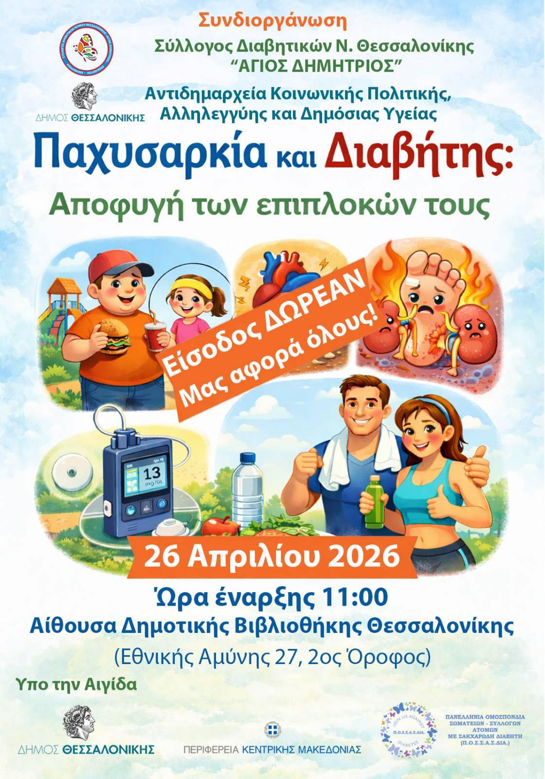Ο Δήμος Θεσσαλονίκης, η Αντιδημαρχία Κοινωνικής Πολιτικής, Αλληλεγγύης και Δημόσιας Υγείας και τα Δημοτικά Ιατρεία, σε συνεργασία με τον Σύλλογο Διαβητικών Ν. Θεσσαλονίκης «Άγιος Δημήτριος», διοργανώνουν ενημερωτική ημερίδα με στόχο την ευαισθητοποίηση των πολιτών και την ενίσχυση της πρόληψης και της δημόσιας υγείας σε θέματα Σακχαρώδους Διαβήτη και παχυσαρκίας.