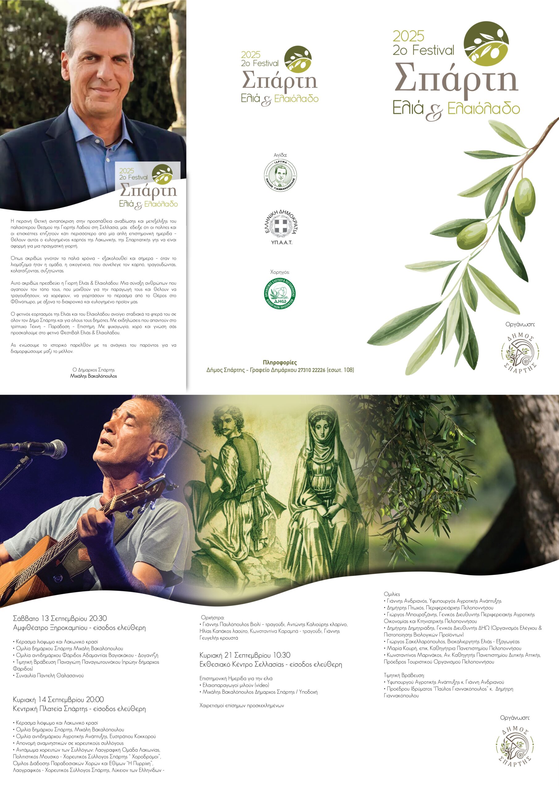 - Το 2ο Φεστιβάλ Σπάρτης Ελιάς & Ελαιολάδου θα διαρκέσει τρεις ημέρες, από 13 έως 21 Σεπτεμβρίου, με εκδηλώσεις που συνδυάζουν τέχνη, παράδοση και επιστήμη.