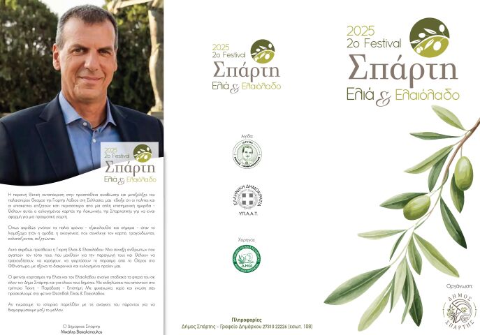- Το 2ο Φεστιβάλ Σπάρτης Ελιάς & Ελαιολάδου θα διαρκέσει τρεις ημέρες, από 13 έως 21 Σεπτεμβρίου, με εκδηλώσεις που συνδυάζουν τέχνη, παράδοση και επιστήμη.