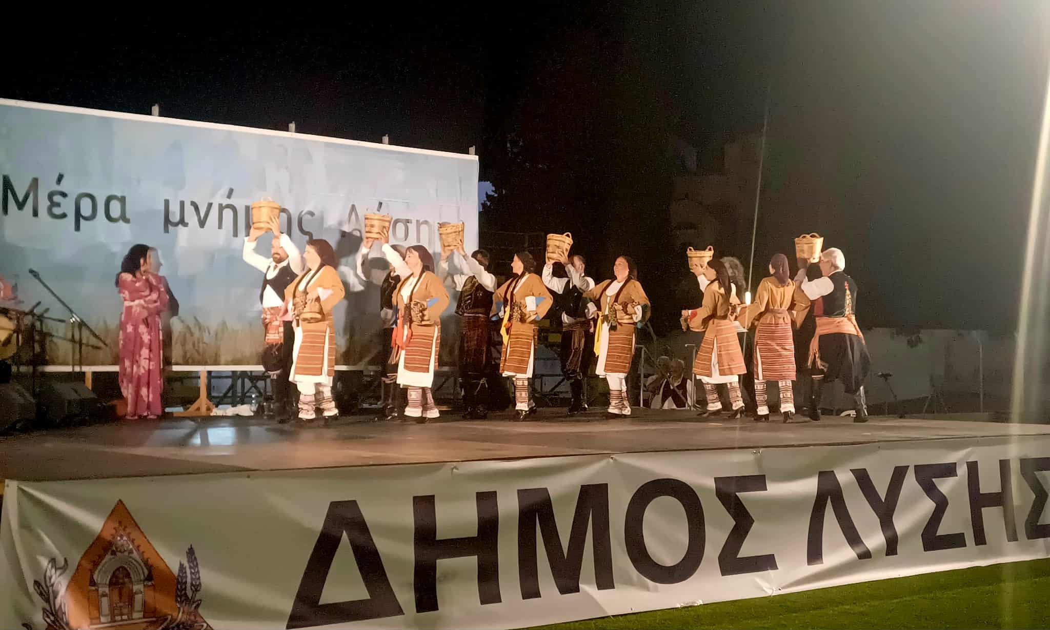 Το συγκρότημα Καλλιτεχνών Λύσης (ΣυΚαΛΥ) απέδωσε με γλαφυρότητα στους παραδοσιακούς χορούς που παρουσίασε σκηνές από την καθημερινότητα των Λυσιωτών, την τοπική λαογραφία και τα έθιμα της σπασμένης στάμνας, ευνοϊκό σημάδι για τη συνέχεια στη γνωριμία δύο νέων ανθρώπων, και του παραδοσιακού πατήματος των σταφυλιών, που αποκάλυπτε την πλούσια σοδειά της αμπελοκαλλιέργειας.