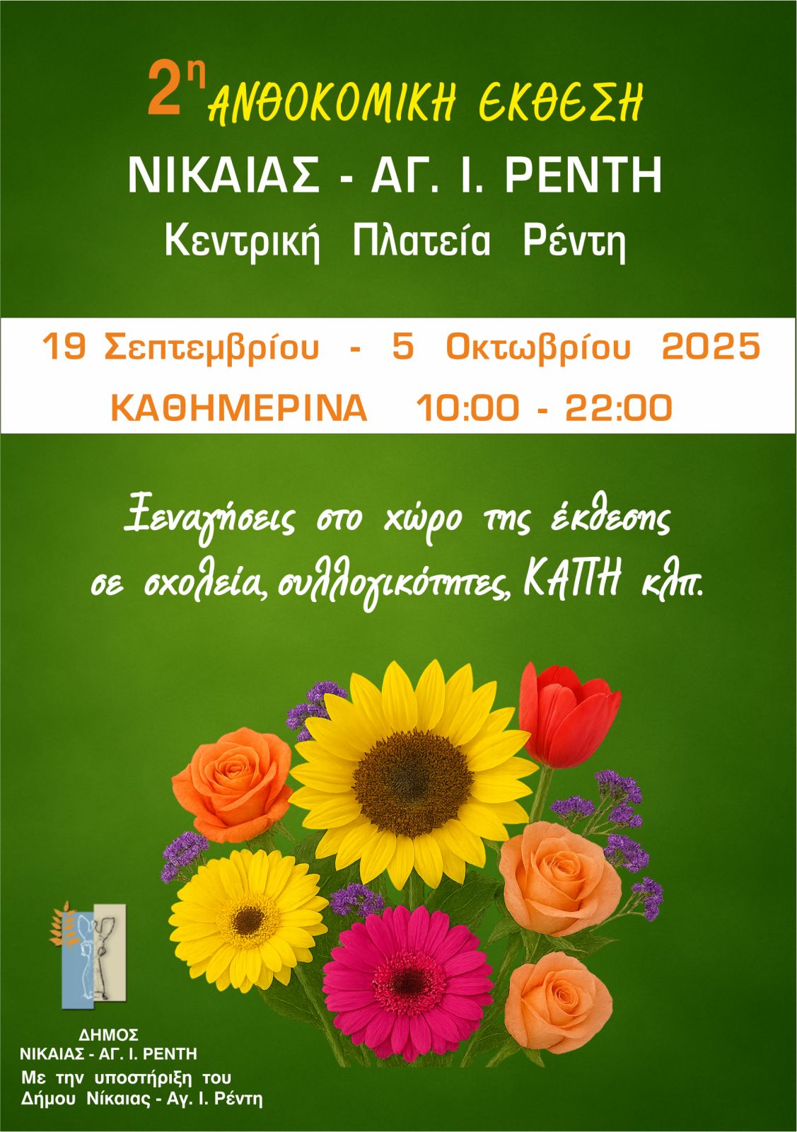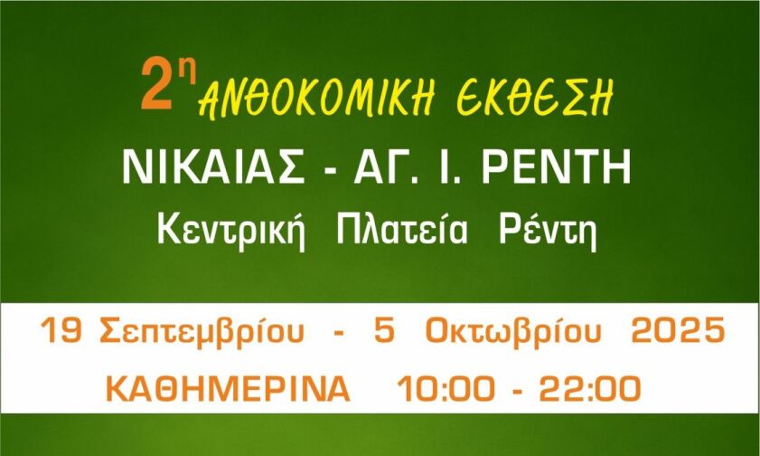 • Η 2η Ανθοκομική Έκθεση του Δήμου Νίκαιας-Αγ. Ι. Ρέντη θα διεξαχθεί από 19 Σεπτεμβρίου έως 5 Οκτωβρίου στην κεντρική πλατεία Ρέντη.