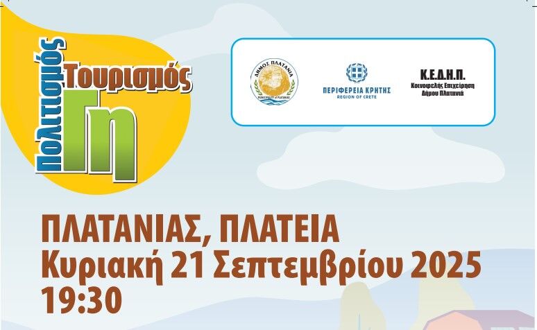 - Το 15ο Φεστιβάλ «Γη – Πολιτισμός – Τουρισμός» θα πραγματοποιηθεί στις 21 Σεπτεμβρίου 2025 στον Δήμο Πλατανιά.