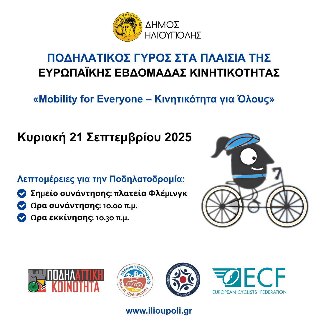 - Ο Δήμος Ηλιούπολης διοργανώνει ποδηλατικό αγώνα την Κυριακή 21 Σεπτεμβρίου στο πλαίσιο της Ευρωπαϊκής Εβδομάδας Κινητικότητας.