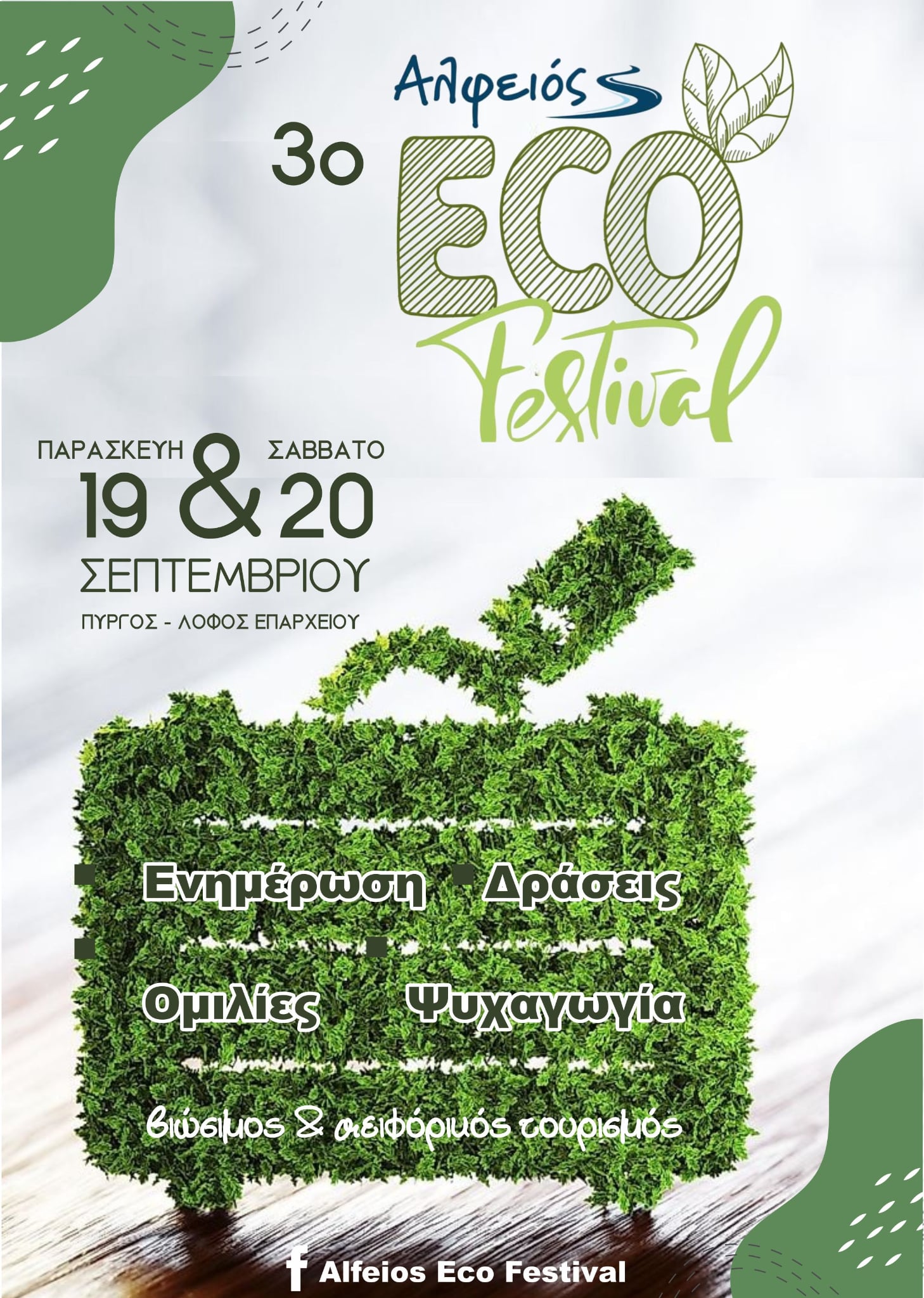 - Το «3ο Alfeios Eco Festival» θα πραγματοποιηθεί στον Πύργο στις 19 και 20 Σεπτεμβρίου 2025, εστιάζοντας στον βιώσιμο και αειφόρο τουρισμό.