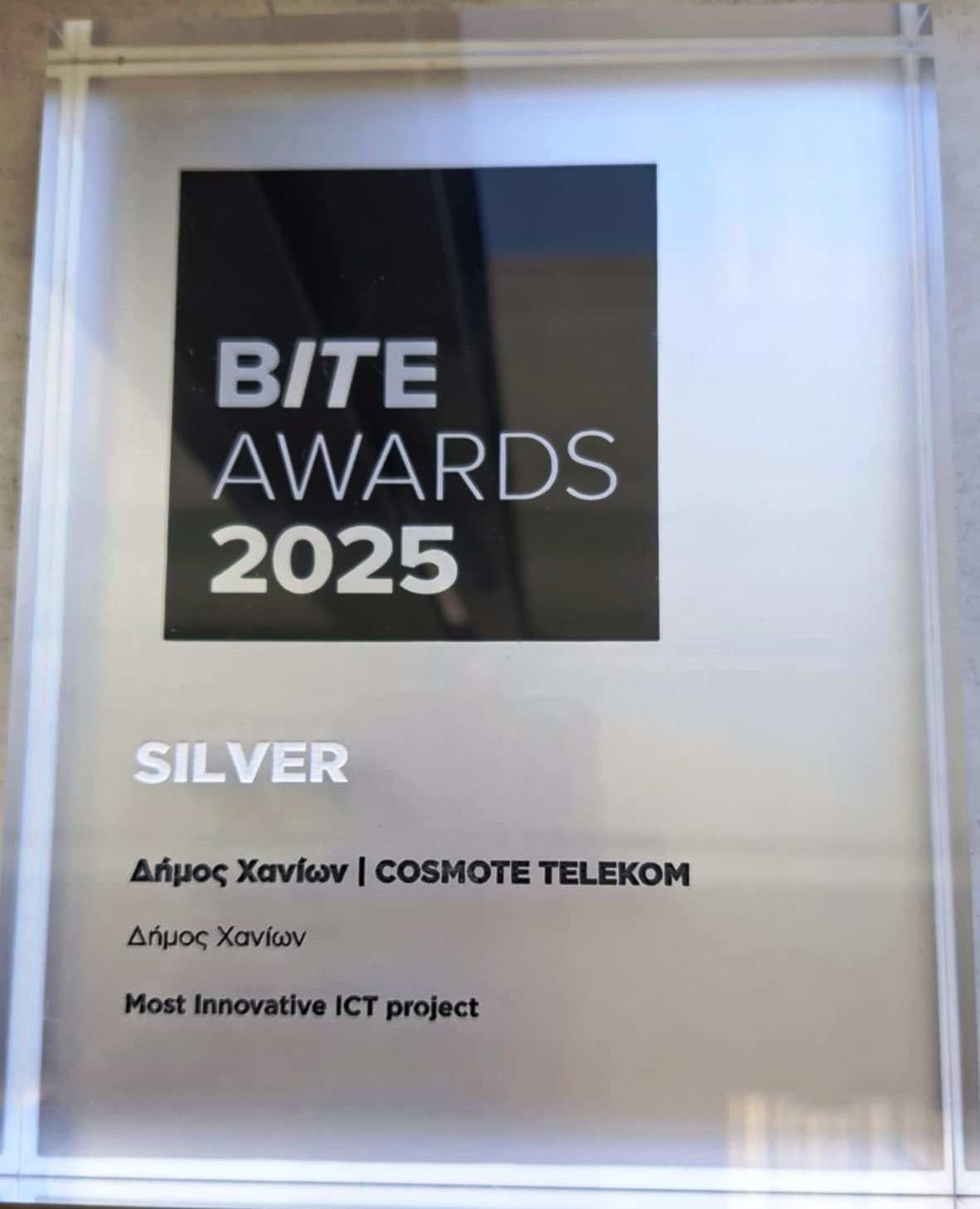 Ο Δήμος Χανίων απέσπασε το Silver Award στην κατηγορία Most Innovative ICT Project στα BITE Awards 2025, για το έργο «Έξυπνο σύστημα ελέγχου πρόσβασης στο Ενετικό Λιμάνι Χανίων», που υλοποιήθηκε σε συνεργασία με τον ανάδοχο COSMOTE TELEKOM.