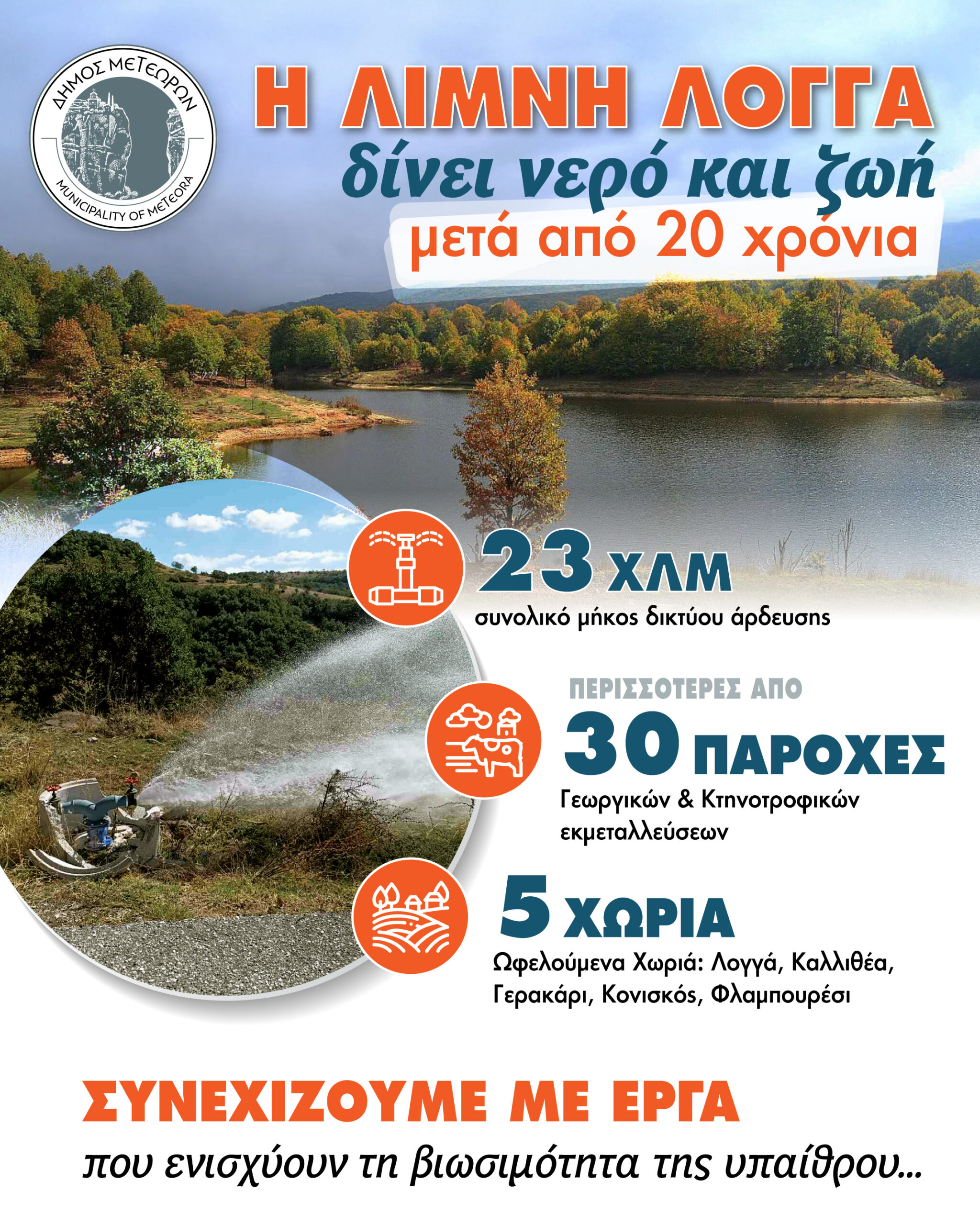Μετά από 20 χρόνια, το αρδευτικό δίκτυο της Λίμνης Λογγά επανήλθε σε πλήρη λειτουργία, παρέχοντας κρίσιμη υποστήριξη σε γεωργικές και κτηνοτροφικές μονάδες της περιοχής του Δήμου Μετεώρων.