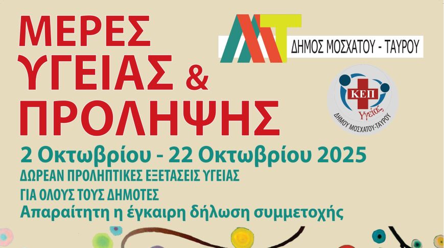 • Ο Δήμος Μοσχάτου-Ταύρου διοργανώνει τις «Μέρες Υγείας και Πρόληψης» από 2 έως 22 Οκτωβρίου 2025, προσφέροντας δωρεάν ιατρικές εξετάσεις.