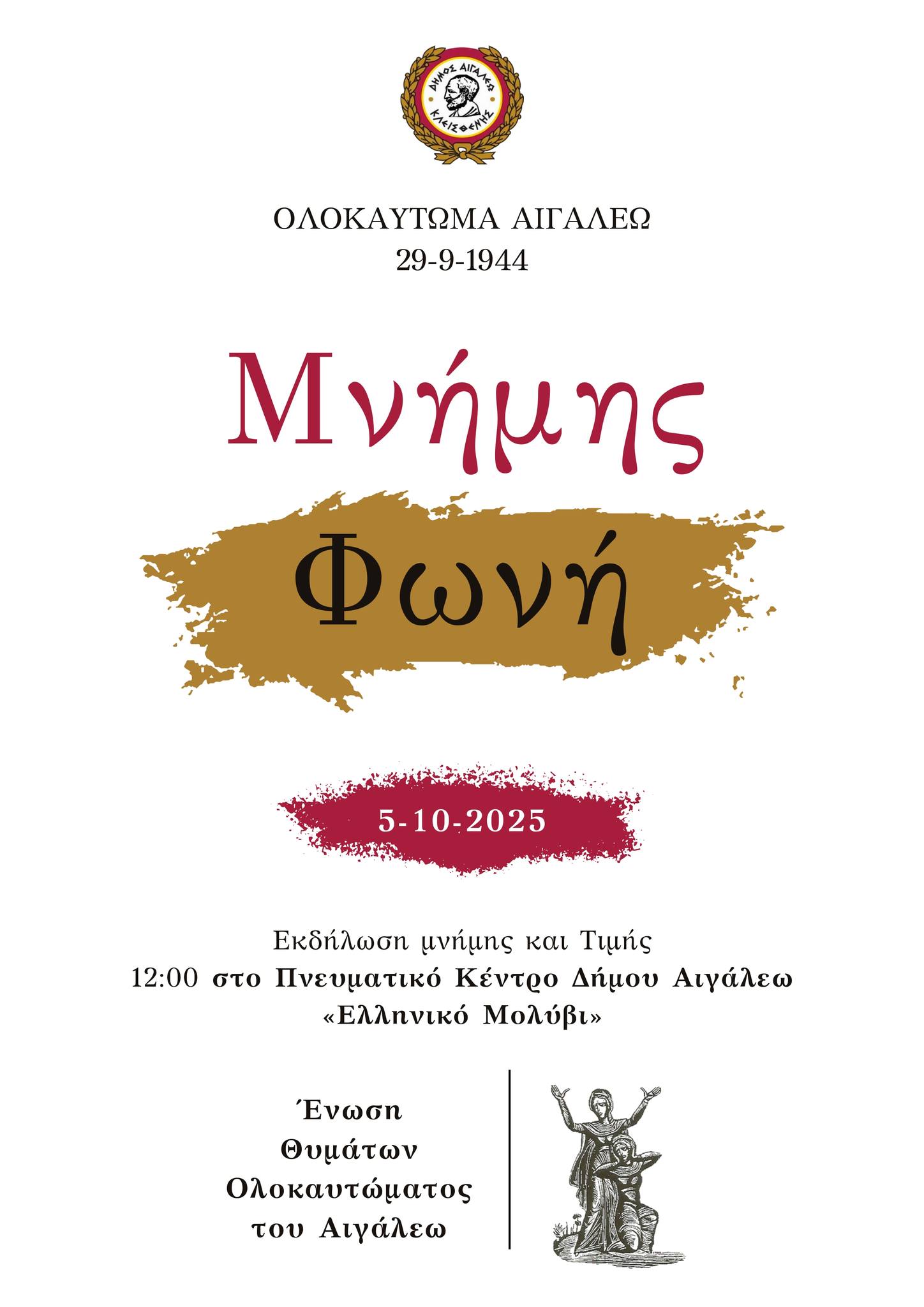 Ο Δήμος Αιγάλεω και η Ένωση Θυμάτων Ολοκαυτώματος Αιγάλεω, σας καλούν να τιμήσετε με την παρουσία σας την Κυριακή 5 Οκτωβρίου 2025, τις εκδηλώσεις μνήμης για τα θύματα της ναζιστικής θηριωδίας της 29ης Σεπτεμβρίου 1944.