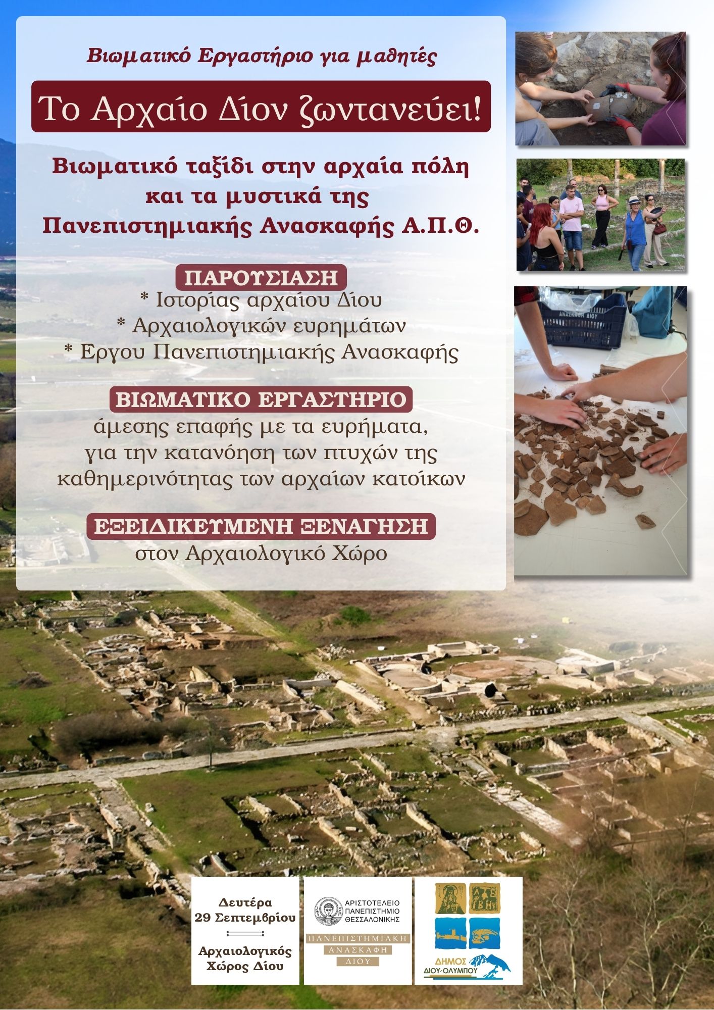 Το πρόγραμμα, που διοργανώνεται από την Πανεπιστημιακή Ανασκαφή του ΑΠΘ και τον Δήμο Δίου-Ολύμπου, περιλαμβάνει παρουσίαση της ιστορίας και των ευρημάτων του Δίου, βιωματικό εργαστήριο με κινητά ευρήματα και ξενάγηση στον αρχαιολογικό χώρο.