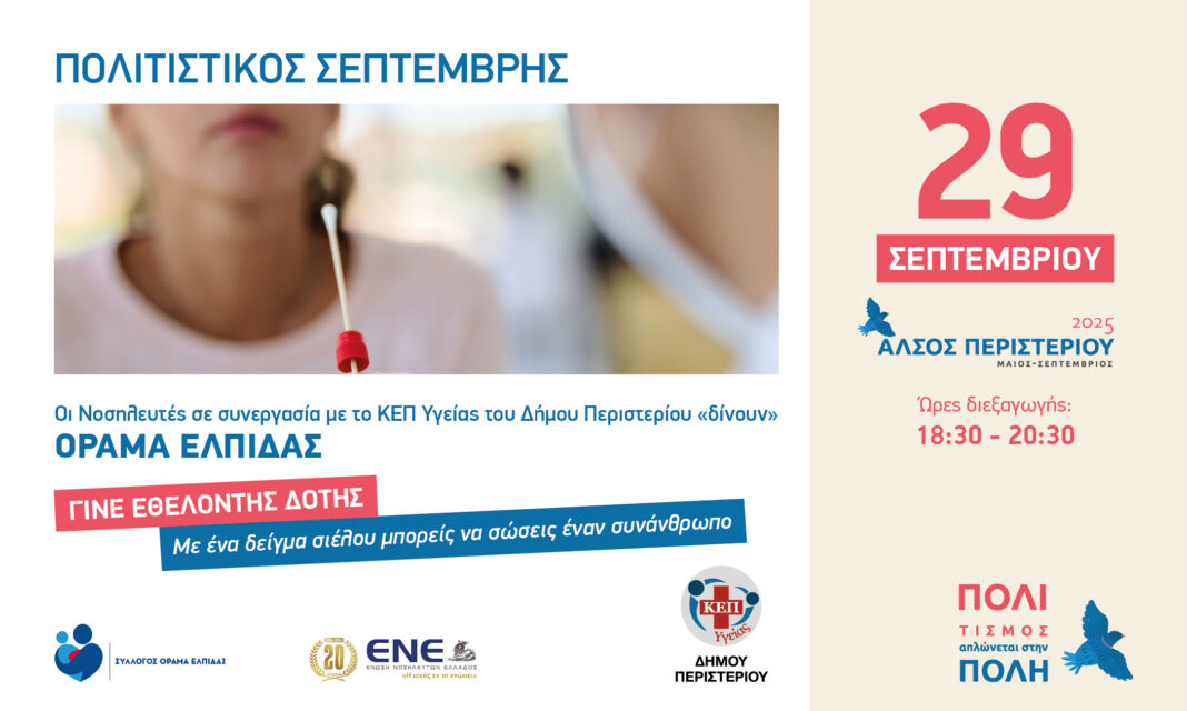 - Το ΚΕΠ Υγείας Δήμου Περιστερίου διοργανώνει εκδήλωση εθελοντικής προσφοράς για την ενίσχυση του Συλλόγου «Όραμα Ελπίδας» στις 29 Σεπτεμβρίου 2025.