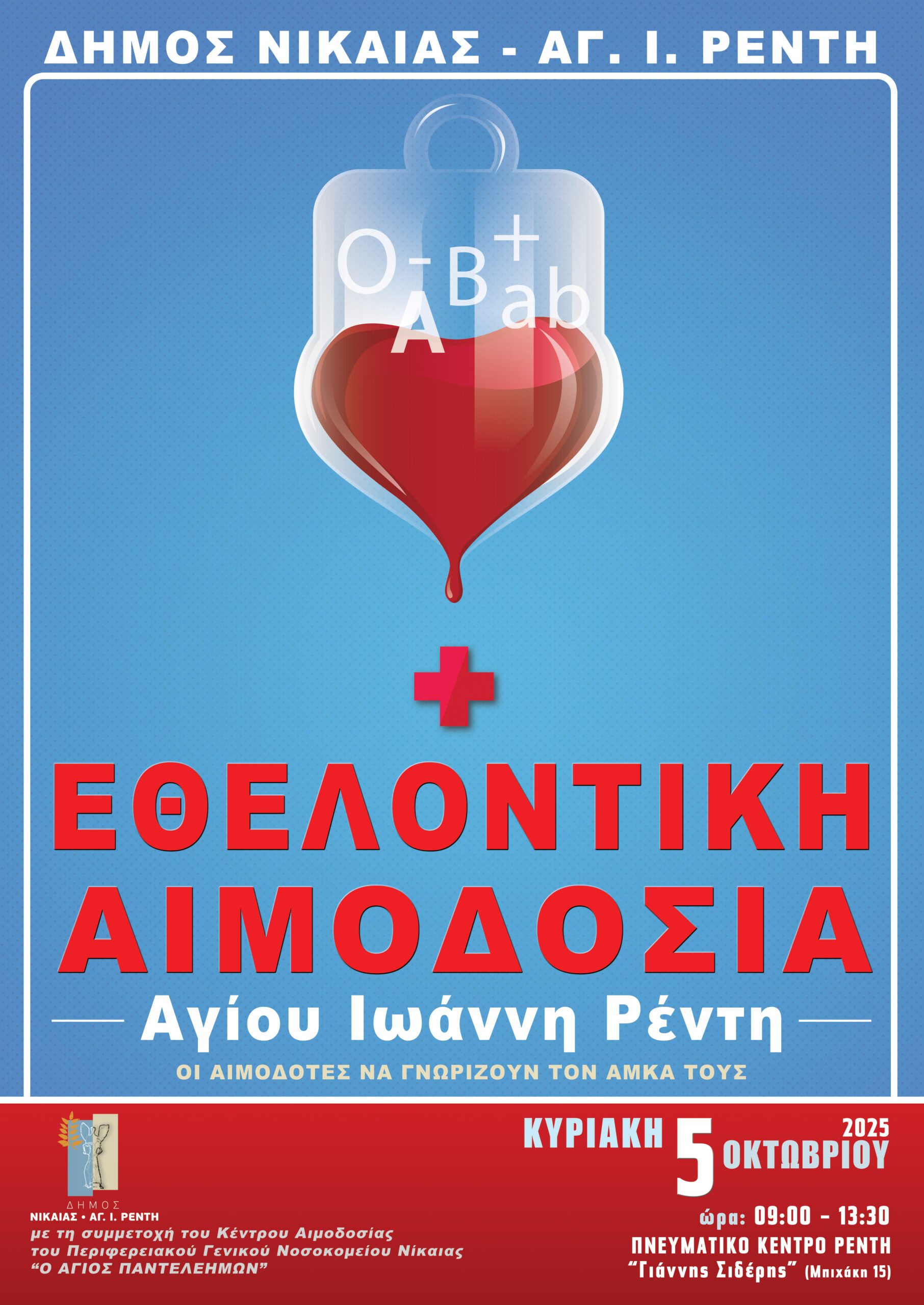 Ο Δήμος Νίκαιας – Αγ.Ι. Ιωάννη Ρέντη, στο πλαίσιο των δράσεων κοινωνικής αλληλεγγύης, διοργανώνει εθελοντική αιμοδοσία σε συνεργασία με το Κέντρο Αιμοδοσίας του Περιφερειακού Γενικού Νοσοκομείου Νίκαιας «Ο Άγιος Παντελεήμων».