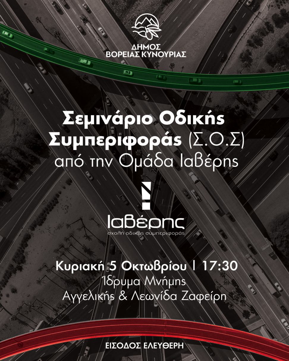 Ο Δήμος Βόρειας Κυνουρίας, σε συνεργασία με τη Σχολή Ιαβέρη, διοργανώνει ένα Σεμινάριο Οδικής Συμπεριφοράς με στόχο την ευαισθητοποίηση του κοινού σε θέματα οδικής ασφάλειας. Η εκδήλωση θα πραγματοποιηθεί την Κυριακή 5 Οκτωβρίου στην αίθουσα του Ιδρύματος Μνήμης Αγγελικής & Λεωνίδα Ζαφείρη, με κεντρικό εισηγητή τον Ιαβέρη junior, γνωστό για τη δράση του στην εκπαίδευση οδικής ασφάλειας.