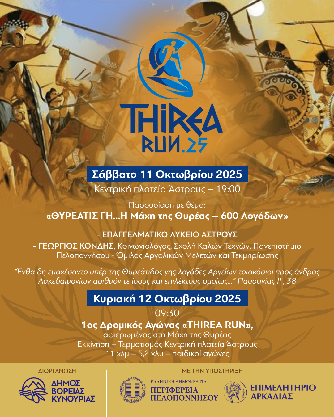 - Ο Δήμος Βόρειας Κυνουρίας διοργανώνει τον πρώτο αγώνα δρόμου THIREA RUN, αφιερωμένο στην ιστορική Μάχη της Θυρέας.
