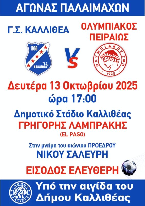 «Ο αγώνας των Παλαιμάχων Καλλιθέας και Ολυμπιακού δεν είναι απλώς ένα φιλικό παιχνίδι· είναι μια συγκινητική αναδρομή σε πρόσωπα που σφράγισαν με το ήθος και την προσφορά τους την ιστορία του ελληνικού ποδοσφαίρου και της πόλης μας.